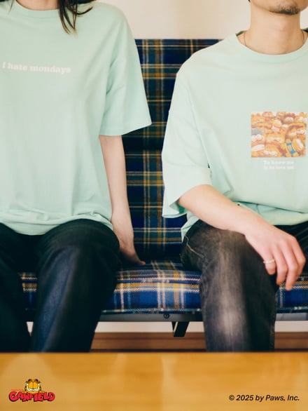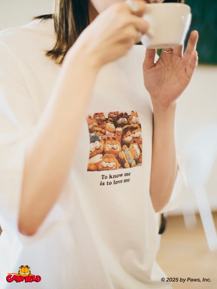 コレクションでは、デザイナーが収集したガーフィールドのヴィンテージドールフィギュアの写真をプリントしたTシャツと、ガーフィールドの親友「オーディ(Odie)」とガーフィールドのイラストをあしらったTシャツ(ともに1万450円)の2型を展開する。ボディは32/1の細番手の糸で編まれた天竺を使用し 、経年劣化したような色褪せたヴィンテージの風合いを加工で再現。袖と裾は天地縫い(シングルステッチ)で仕上げ、袖には表振り3本針ステッチワークを施した。カラーはホワイト、グレー、ミントの3色を揃える。