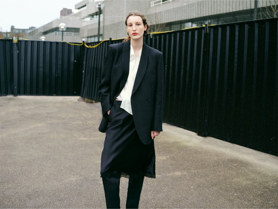 jacket ¥630,300, top ¥344,300, inner top ¥171,600, skirt ¥199,100 and trousers reference item by THE ROW THE ROW JAPAN