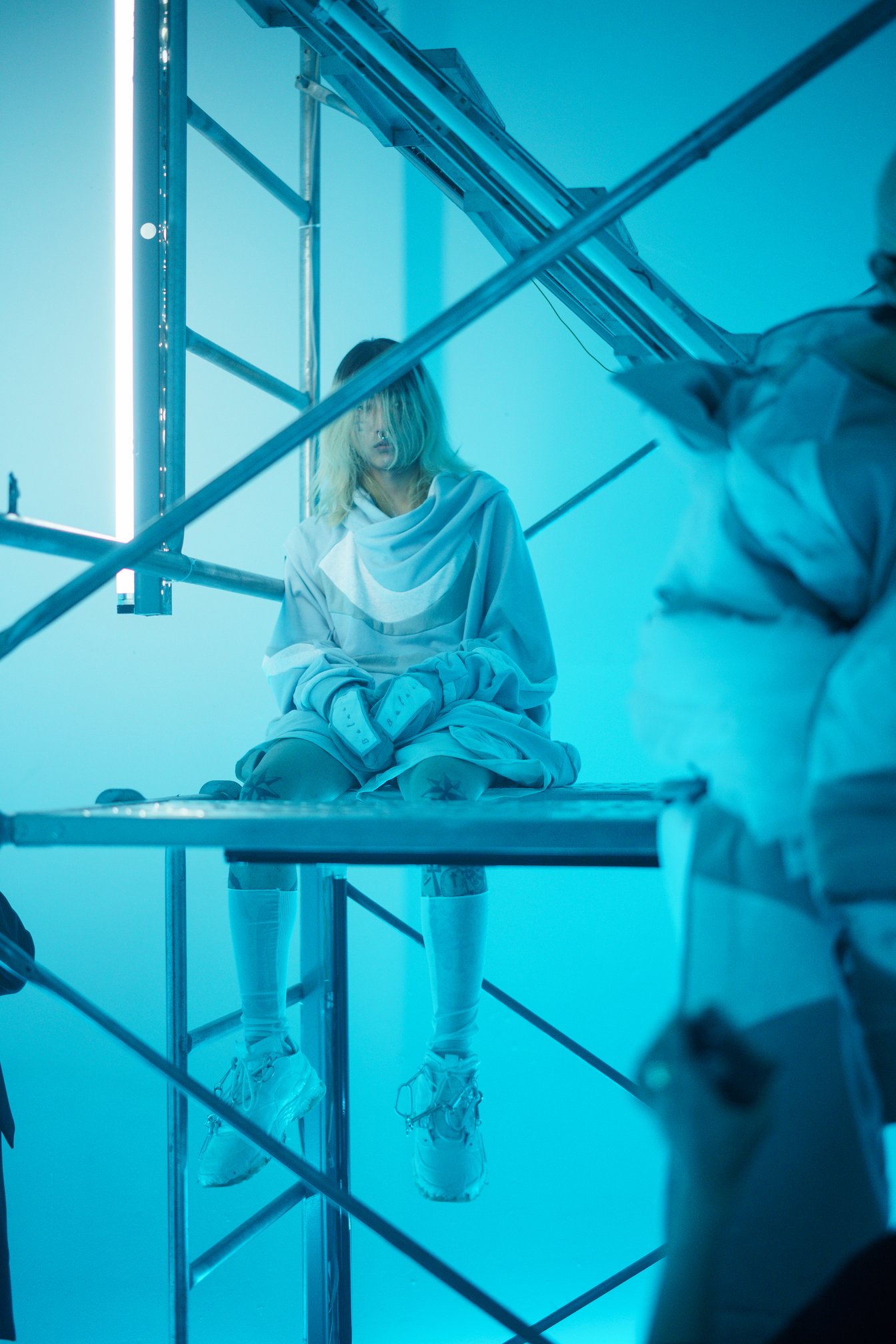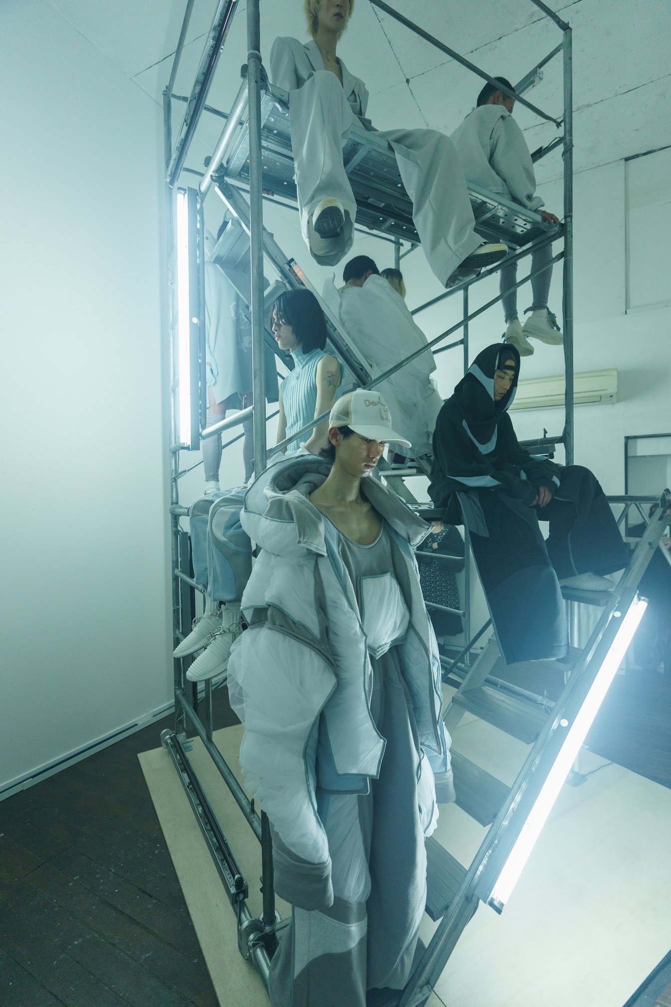 ハチの原宿に対する異様とも言える執着は、モデルの足元に巻きつけられたカラビナを連ねた鎖のようなディテールからも感じ取れる。鎖は、何かを繋ぎ止めるものとして機能する。会場の立地を加味すれば、さまざまな事情で行き場をなくし、そこにとどまるざるを得ないトー横キッズと、かつての原宿にこだわるハチは、どちらも同じく「街に鎖で繋がれている者」と言い換えることもできるだろう。モデルが歩くたびに静寂の会場の響く鎖がぶつかる音は、そこにとどまるざるを得ないこと/執着していることを周囲に対して強烈に意識させる。