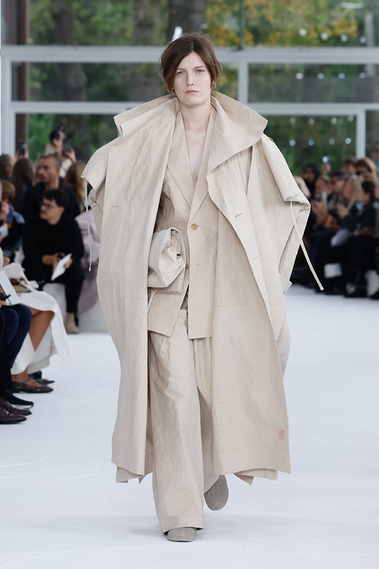 4つ目のルックで、麻を原料とした和紙(麻紙)で仕立てた紙衣が登場した(ちなみに、和紙をそのまま使用したものを「紙衣」、和紙を細く裁断し織った布を「紙布」という)。和紙のテーラードのセットアップの上にオーバーサイズの変形コートを羽織ることで、素材感がダイナミックに強調されている。素朴な色味の中で、裏地に押された朱印がさりげないポイントになっていた。コートは平面性を備えたパターンワークによって、歩くたびに張りのある和紙が空気にぶつかり、固く揺れ動く。