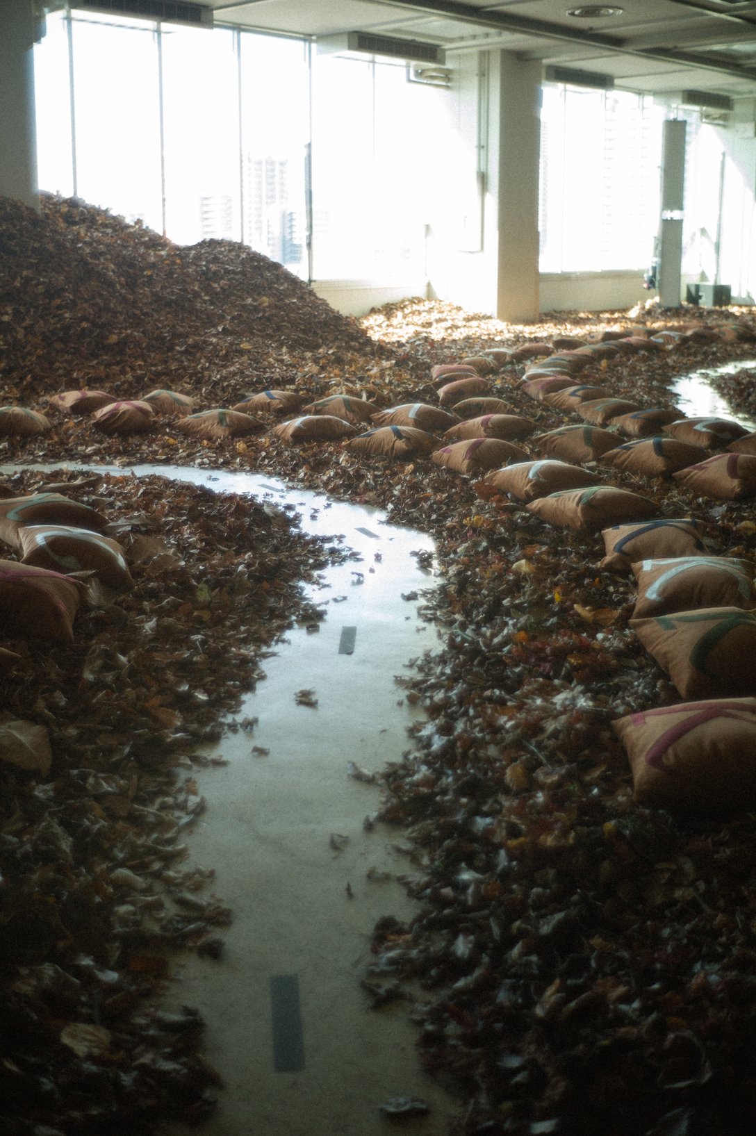2トントラック4台分、ダンボール600箱の枯葉が運び込まれる。枯葉はいずれもKokiの実家がある山梨県の山から採集されたもの。秋口の発色が美しい時期に拾い集めた枯葉を、ドライフラワーを製造する家業の乾燥機で乾燥させ、色褪せないように保管していたという。