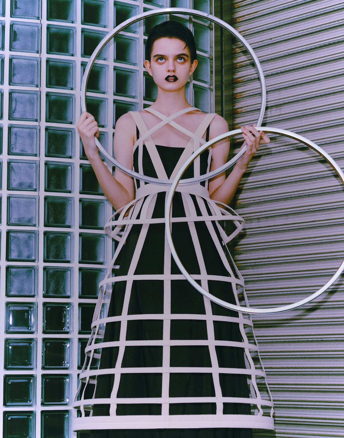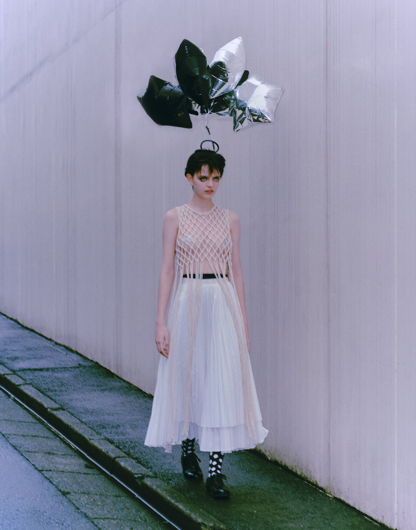 これは、普段サーカスで働いている女の子が、サーカスから抜け出して街中に入り込んで、サーカスをしながら遊んでいるというコンセプト。だから馬が登場したり、フラフープをやっていたり、風船が出てきたりしているんです。でも、実はこの撮影の日は天気が最悪で。初めてのエディトリアルだったので、ロケハンもしたしロケバスまで出してすごくお金をかけて臨んだのに、当日大雨になってしまいかなりショックでした。だから、よく見ると地面も濡れているんですけど、テーマ的にスタジオで撮るわけにもいかず、なんとか粘って雨が止む隙を見計らいながら撮影しました。すごく大変でしたが、結果的にいいものが生まれたのでよかったです。