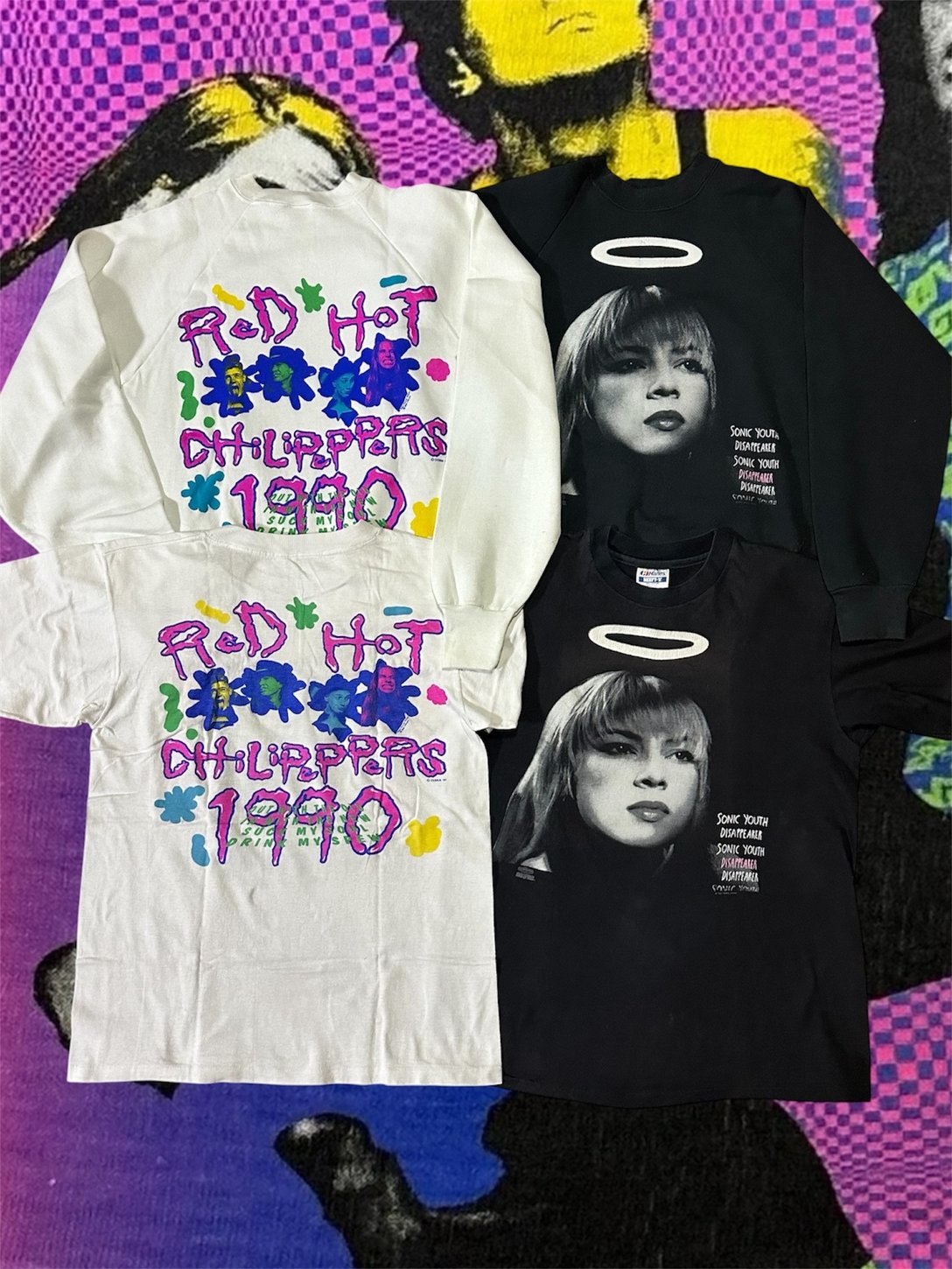 three days:RED HOT CHILI PEPPERSは1989〜90年にかけてのツアーのアイテム、Sonic Youthは1990年に発売されたアルバム「Goo」からのシングルカット曲「DISAPPEARER」のアイテムです。Tシャツも希少ですが、当時のスタッフ用と言われるスウェットは更に珍しいスペシャルアイテムです。