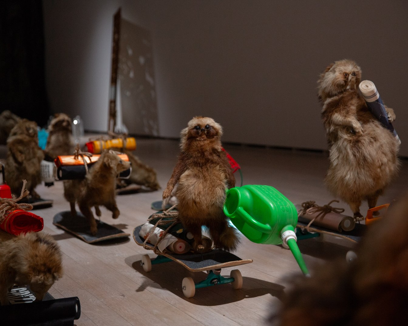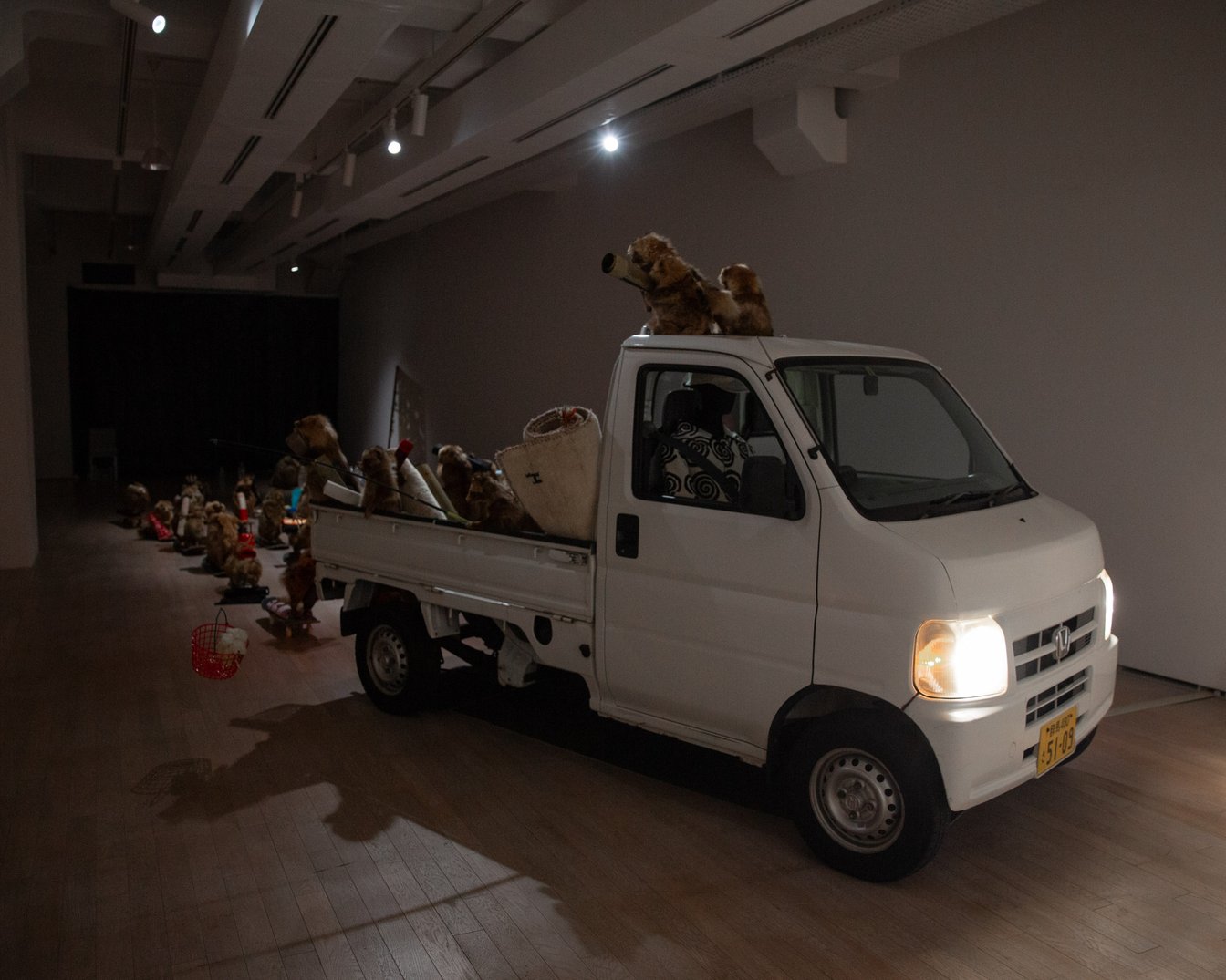 バックライトを光らせる軽トラと大量の狸の剥製でできたインスタレーションは、会場準備のための3週間で即興的に生み出された作品。狸たちは、シルク産業の名所である群馬県桐生市の織物工場に眠っていた反物を抱えている。