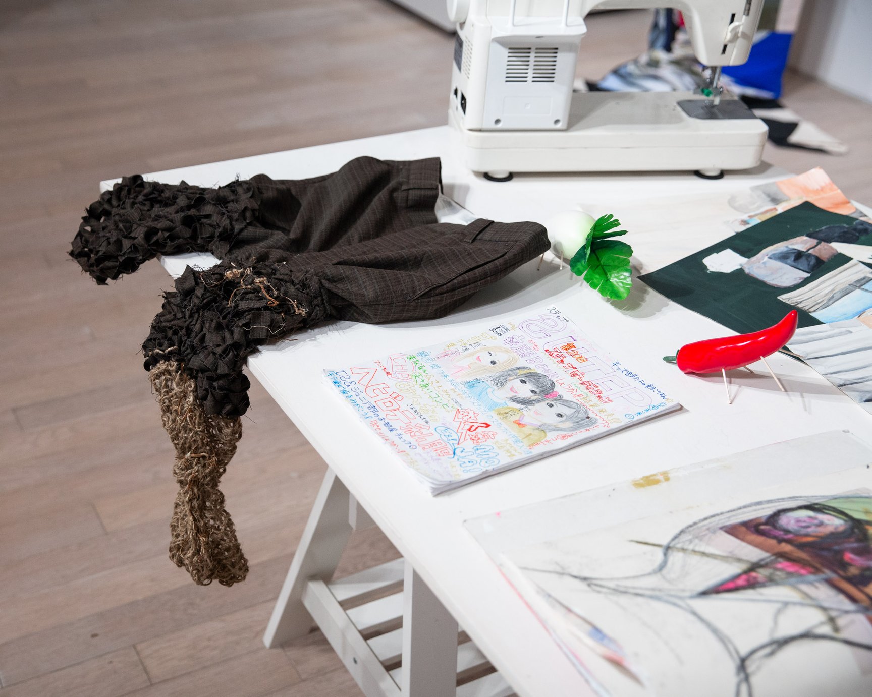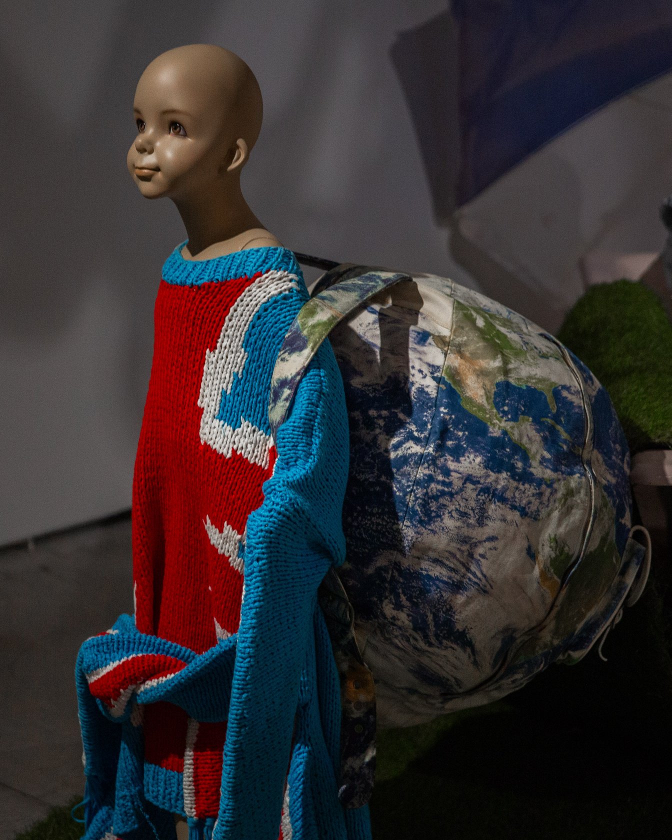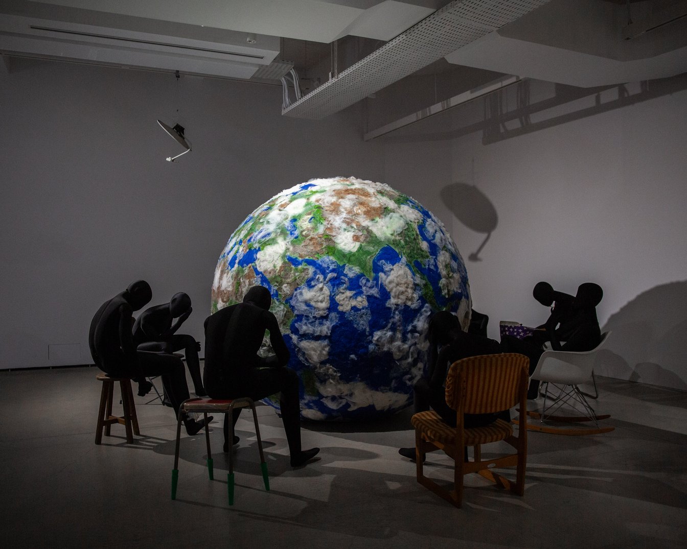 ホワイトキューブの中に置かれた家具たちに紛れて配置された過去のコレクションピースたちの中には、当時とは異なる形でプレゼンテーションされているものも多い。世界平和を願って作られた2015年秋冬コレクションのニードルパンチでできた地球は、ショーでは子どもたちが歌う「ヒール・ザ・ワールド」と共にピースフルでユーモラスな雰囲気の中で発表されたが、今回はその周りをうなだれた人物たちが取り囲む。プレスプレビューの直前まで山縣が調整を重ねていたこの章は、探検するように細部を観察することで細部にまで宿るこだわりを感じ取ることができる。