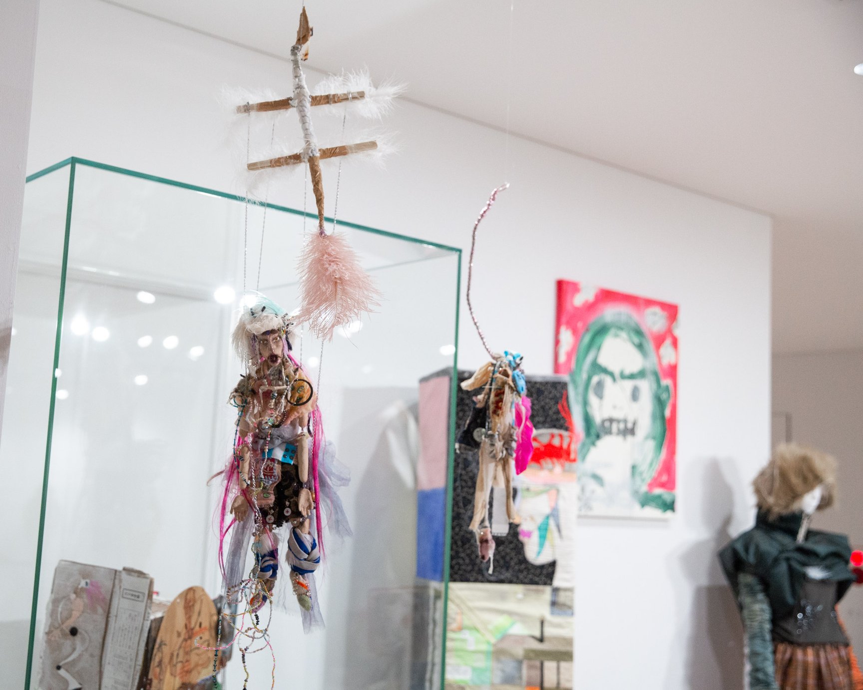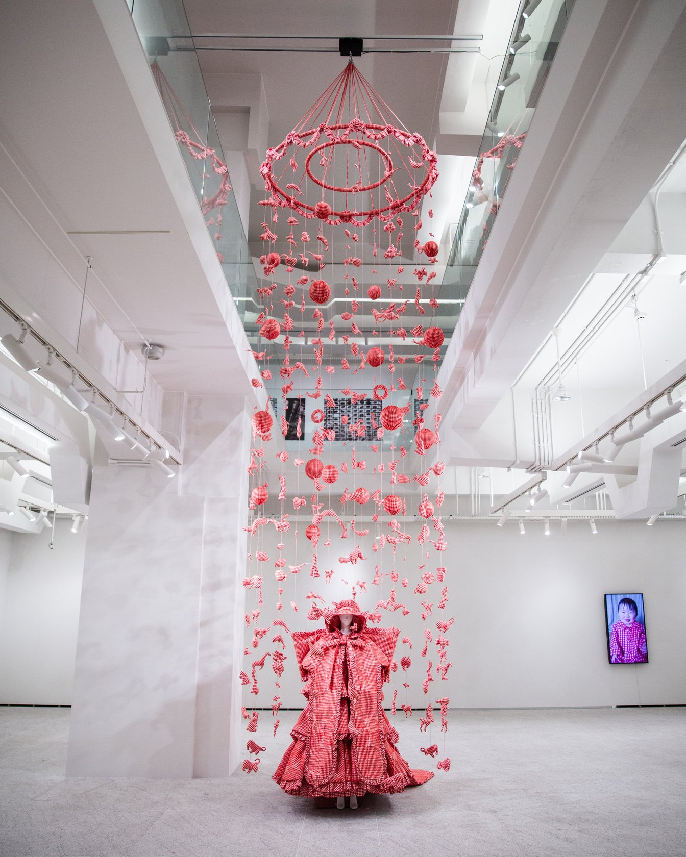 ルックの周囲には、同素材で制作した子どもの成長を願って作られる伝統工芸品の雛人形「つるし雛」が飾られ、展示室の壁面には山縣がiPhoneで撮影した愛息子の動画が流れている。