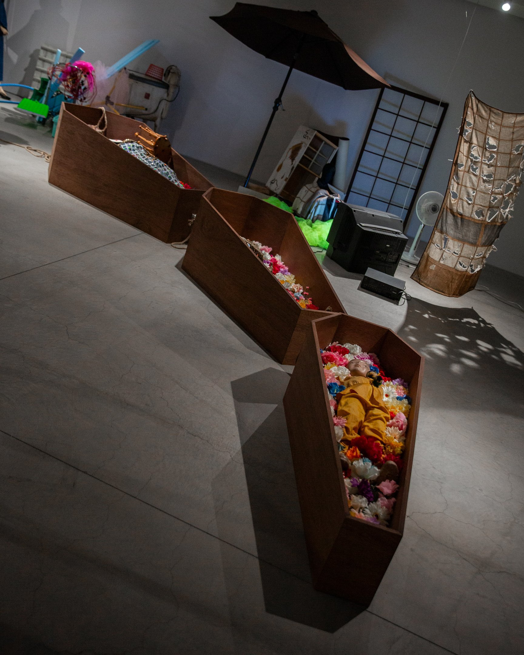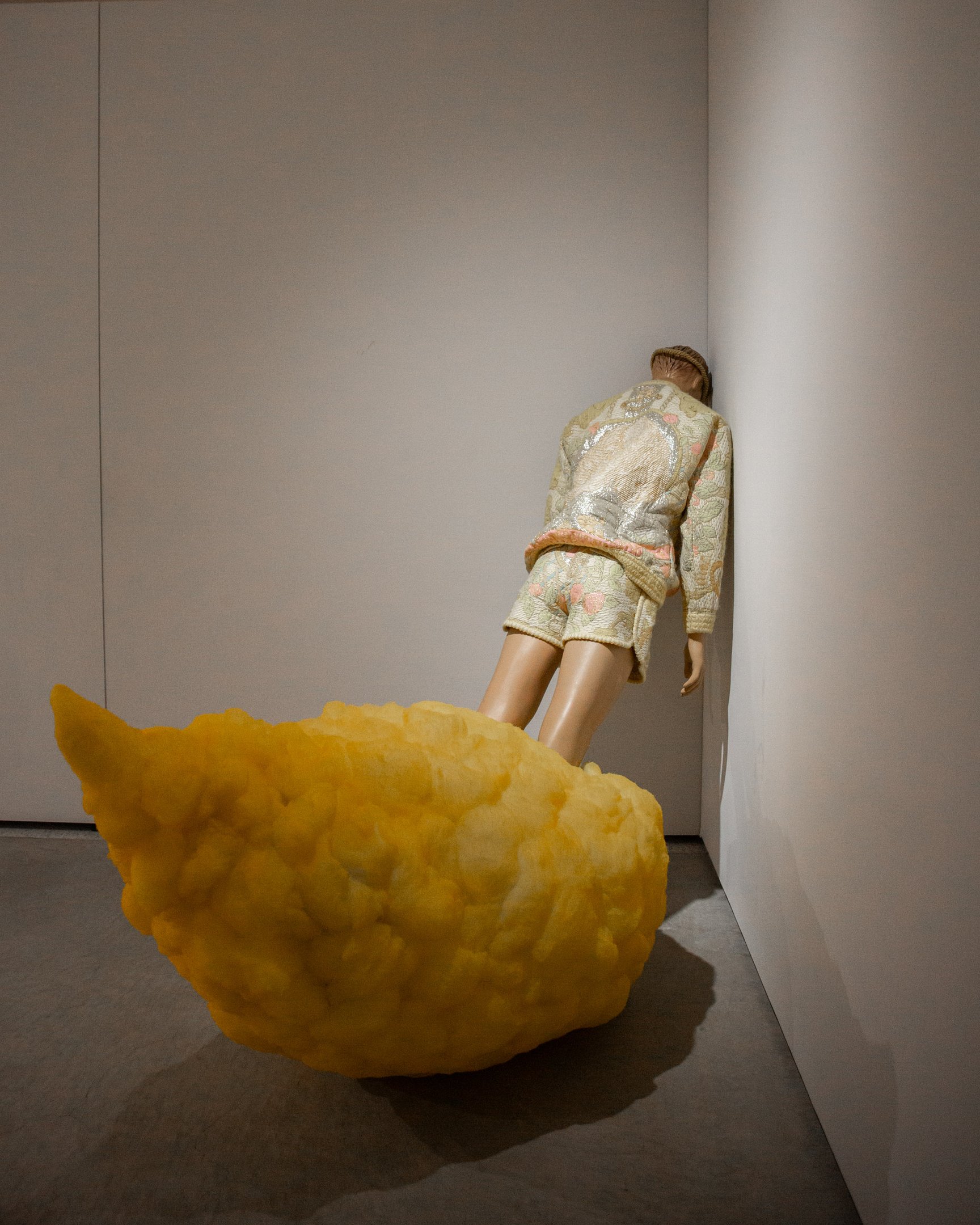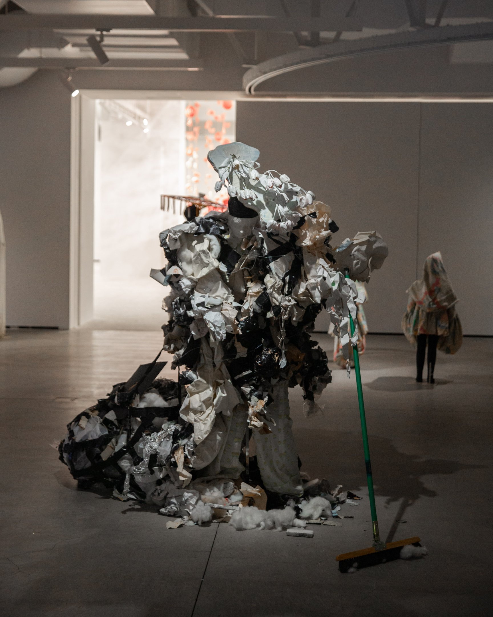 畳を模したテキスタイルでできたドレスは、泥酔してうずくまった人の周りに水のペットボトルが並べられるインターネットミームのように展示。孤立の中に滲む、他者との連帯感を感じさせる。