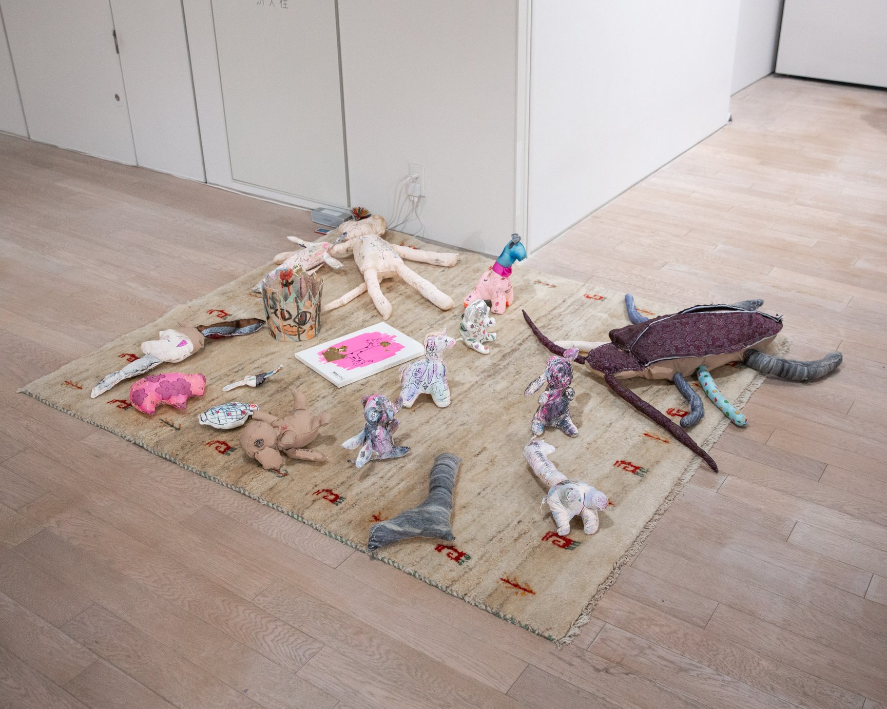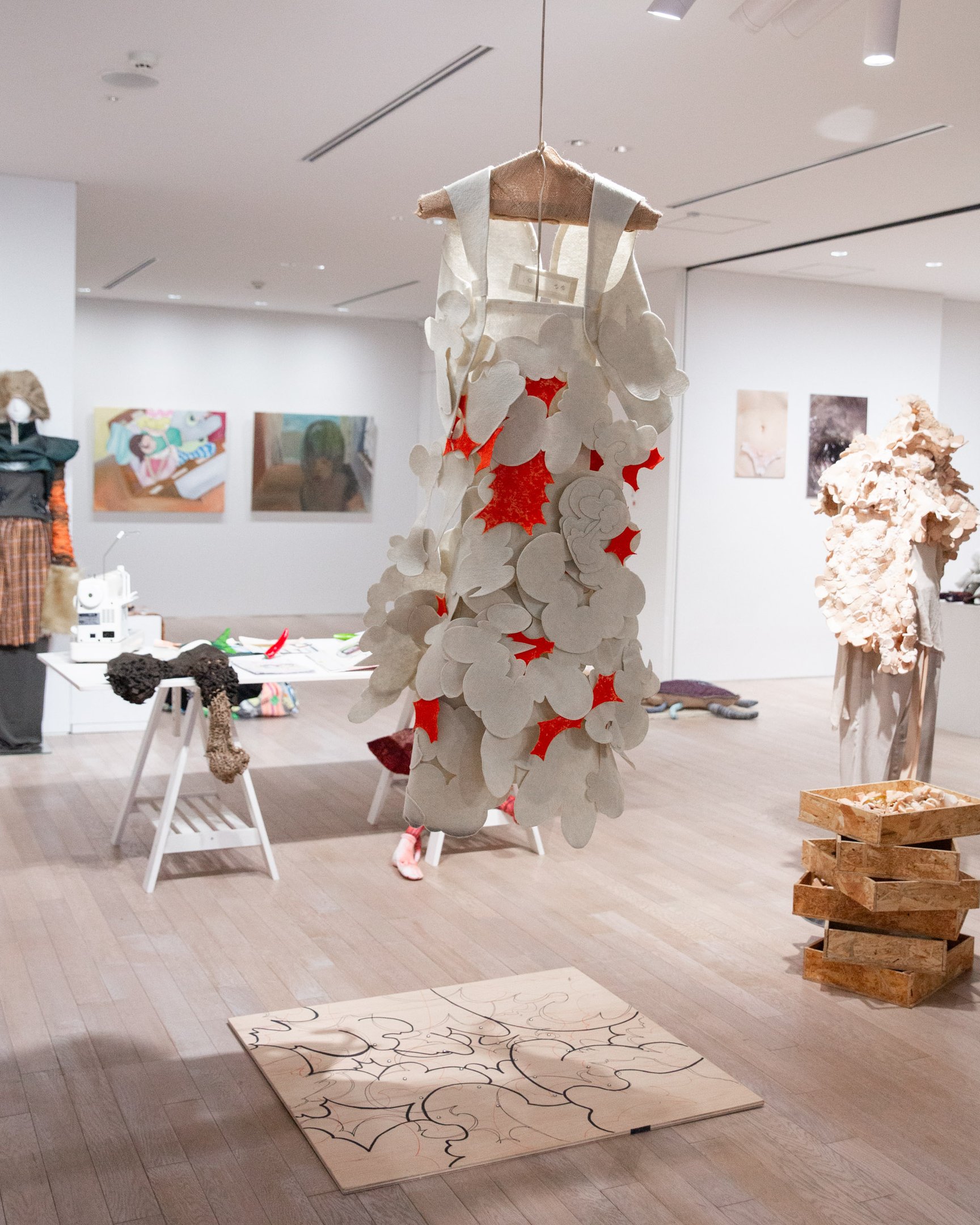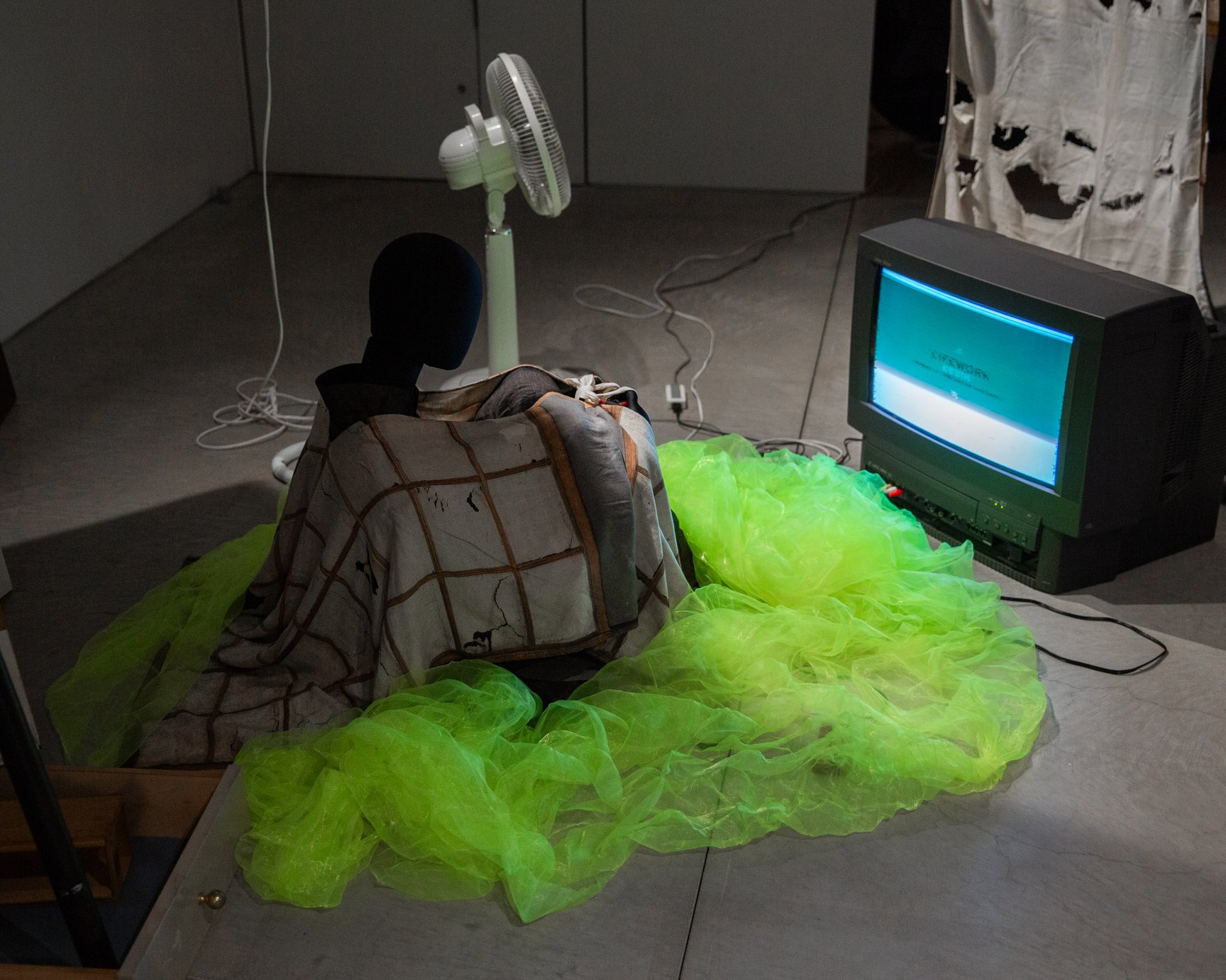 畳を模したテキスタイルでできたドレスは、泥酔してうずくまった人の周りに水のペットボトルが並べられるインターネットミームのように展示。孤立の中に滲む、他者との連帯感を感じさせる。