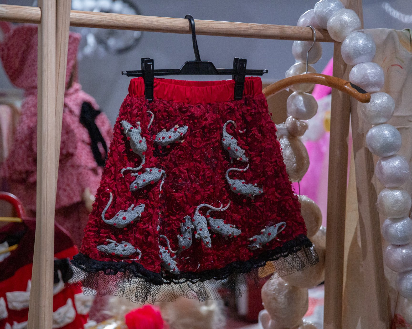 中央に飾られた1体は、ベビー服に着想したドレス。リトゥンアフターワーズのキーカラーである赤のギンガムチェックに、花束や贈り物といった祝福を表すモチーフや、ブランドを想起する本、日常生活を象徴する「ゴミ袋にたかるカラス」を刺繍で描いたキルティング生地で仕立てた。
