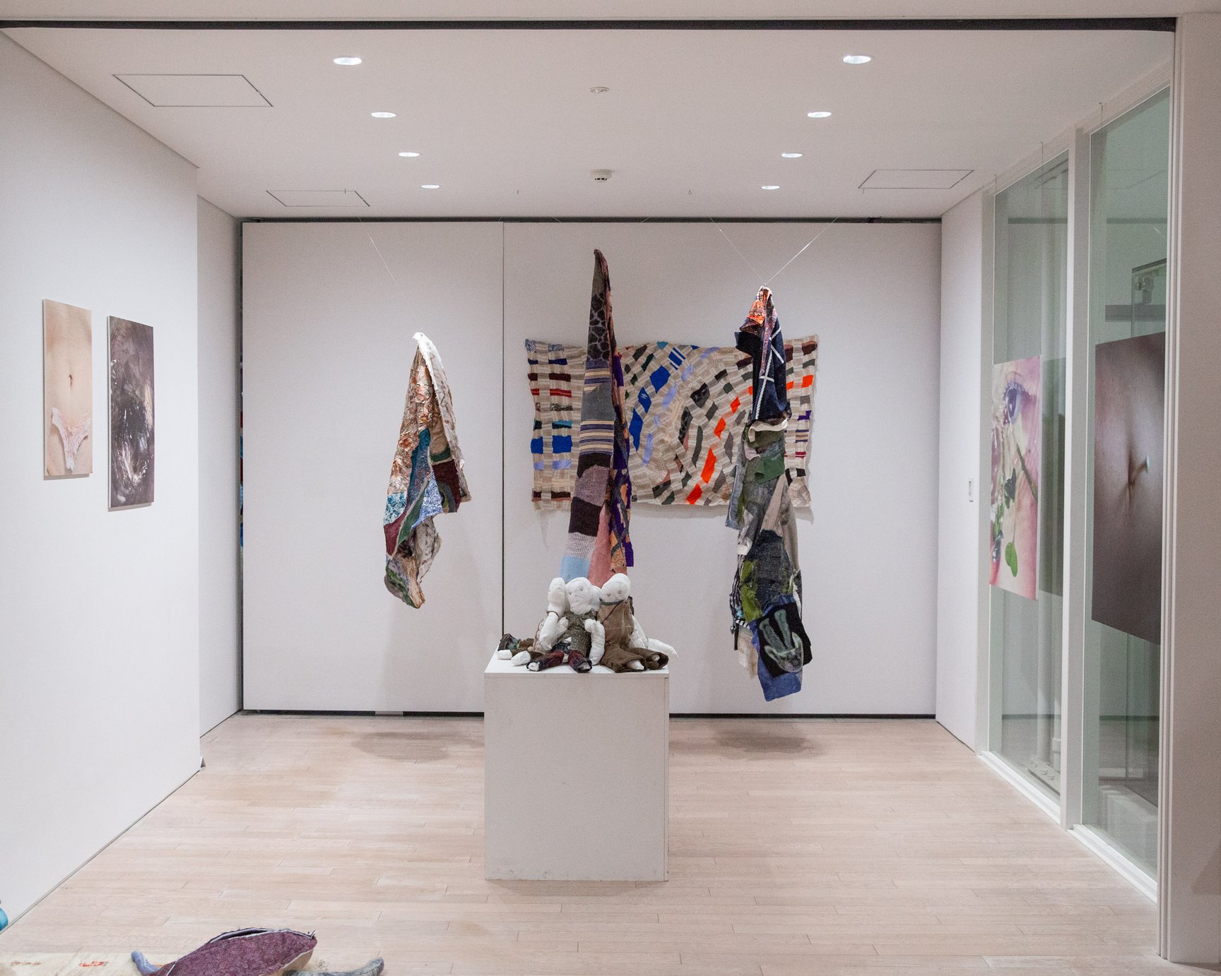 第0章に続く吹き抜けの下の展示室。だんだんと暗がりに向かっていった前章までと打って変わり、明るく開けた空間には、初公開となる最新作が置かれている。ファッションを通して自己と社会に向き合ってきた山縣の社会に向けた視線を感じるこれまでの展示室と対比的に、山縣のパーソナルな部分に立ち返る。