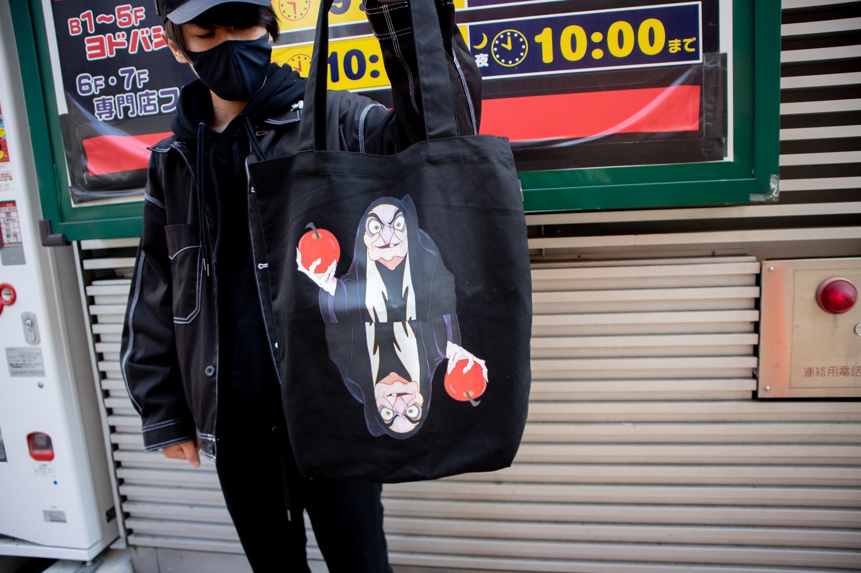 ジップジョガーパンツや、ポーチ、トートバッグ、マスクなどを買いました。全部で3万5000円ぐらいです。ジョガーパンツはかなり気に入ったので、展開している3色全て買いました。サラッと着られるような素材感で、ポケットが外側に付けられているのでシルエットも綺麗ですし。裾にあるジップに重さがあって、生地の落ち感、デザインのバランス感が凄く良いんです。トートバッグは、今回のグラフィックの中で一番好きな白雪姫の魔女のものを選んだんですが、マチがあって容量も結構あったりと細かいディテールに惹かれました。かなり使い込むと思います(笑)。