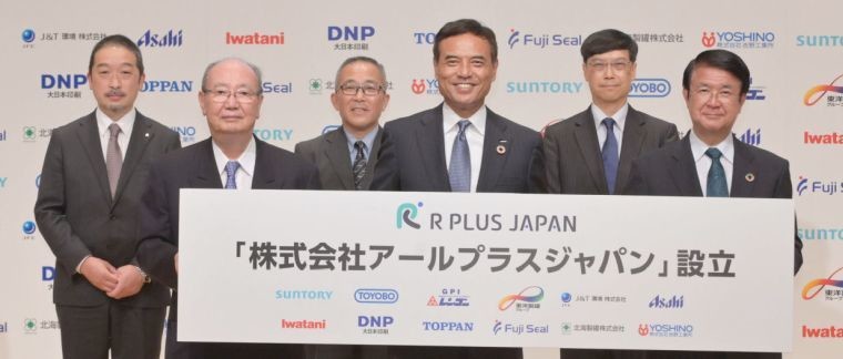 結成を呼び掛けたサントリーホールディングス新浪社長(中央)、東洋紡の楢原社長(右端)ら