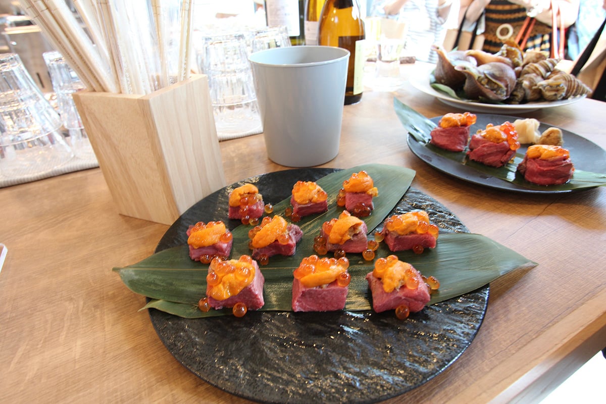 「魚貝と野菜 札幌さんど。」は、札幌・ススキノで20年営業している「肉とろばたさんど。」の2号店。昼は道産野菜のランチ弁当、夜は産地直送の魚貝など素材の味を活かした料理を提供。道産小麦「ゆめちから」を使用したメロンパンもテイクアウト可。低温調理した和牛に北海道産のうにといくらをのせた贅沢な一品は、利き酒師がセレクトしたこだわりの道産酒と合わせていただこう。