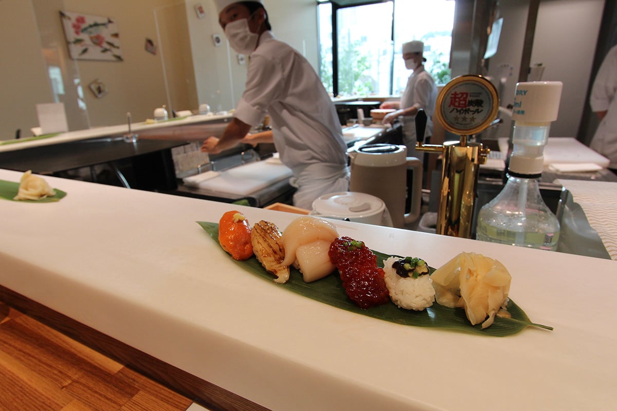「立食い寿司 根室花まる」は北海道の人気寿司店。オホーツク海の恵みと「魚の本当の味」を感じられる圧倒的な鮮度が魅力。この日の五貫セットは、根室の赤ほや、紅鮭筋子醤油漬け、二階建て生ほたて、炙りえんがわ焦がし醤油、鮭のめふん軍艦(1,010円)。見た目や味も独創的で目でも舌でも楽しめる。