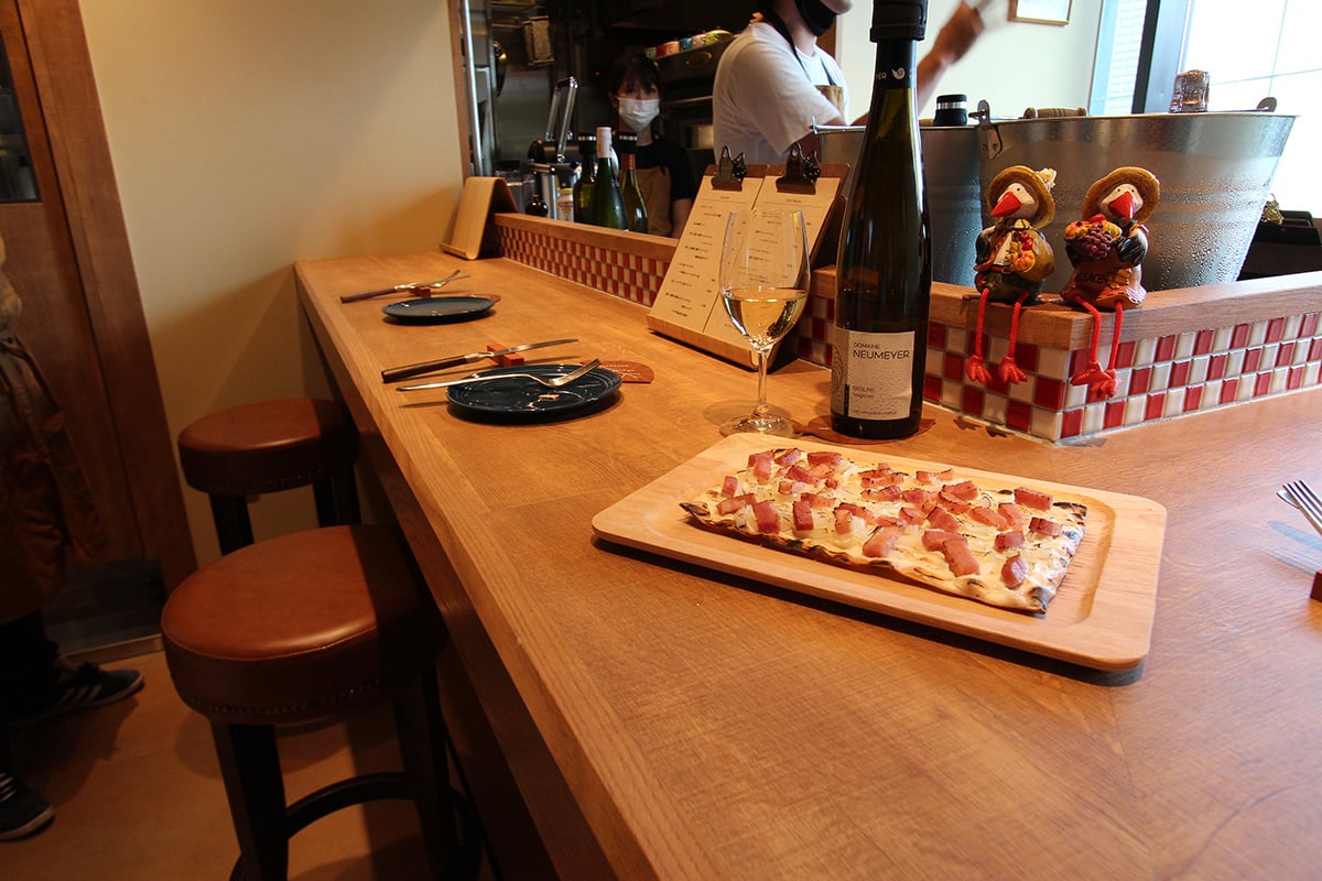 「La colere(ラ・コレール)」は、ミシュランガイド東京で一つ星を獲得した外苑前のフレンチ「L'orgueil(オルグイユ)」の新業態。ここでは「タルト・フランベ」(¥900)というフランスのアルザス地方で100年以上食べられている郷土料理にアレンジを加え提供する。しっかり焼いたパリパリの生地に、フランスから輸入したフロマージュ、薄くスライスした玉ねぎとベーコンをのせた一品だ。白ワインと一緒に食べたらベストマッチ間違いなし!