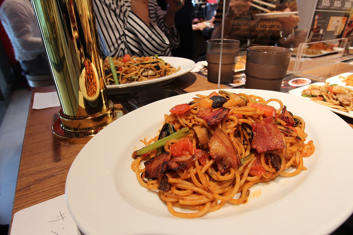 「おなかいっぱいの幸せ」をコンセプトにした焼きスパゲッティ屋「ローマ軒」。昼は焼きスパゲッティ、夜はカジュアルな多国籍バルに変身するこのお店。2.2㎝のオリジナル極太麺に特製ソースを鉄板で絡めた焼きスパゲティはボリューム満点。各テーブルにサーバーが設置され、ビールを自分で注いで飲むことができる飲み放題は酒飲みにはたまらないシステム。