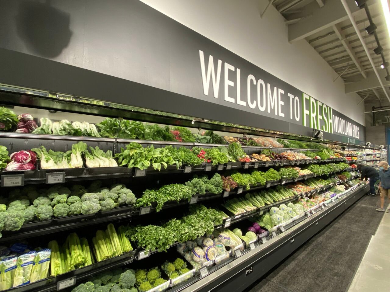 「ようこそ新鮮なウッドランドヒルズ店へ(Welcome to Fresh Woodland Hills)」とあるアマゾンフレッシュの青果コーナー。アマゾン・フレッシュではオーガニックや一般的な青果物をあつかい、ホールフーズ・マーケットの品質レベルを維持