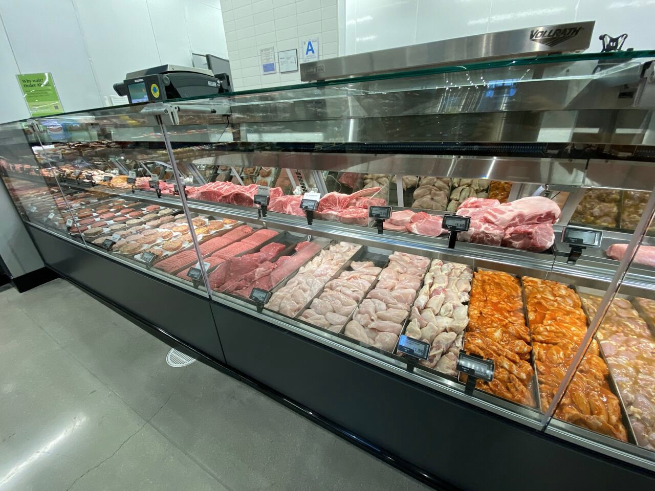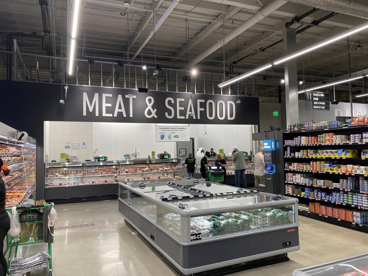 入り口から真正面奥にあるのは精肉・シーフードコーナー。牛肉の等級は上から2番目となる「チョイス(Choice)」だ。対面販売でありながら、肉やシーフードも買い物しながらスマートフォン・アプリを介してモバイルオーダーも可能となっている。こちらのタグもすべてデジタルタグが使用されている。
