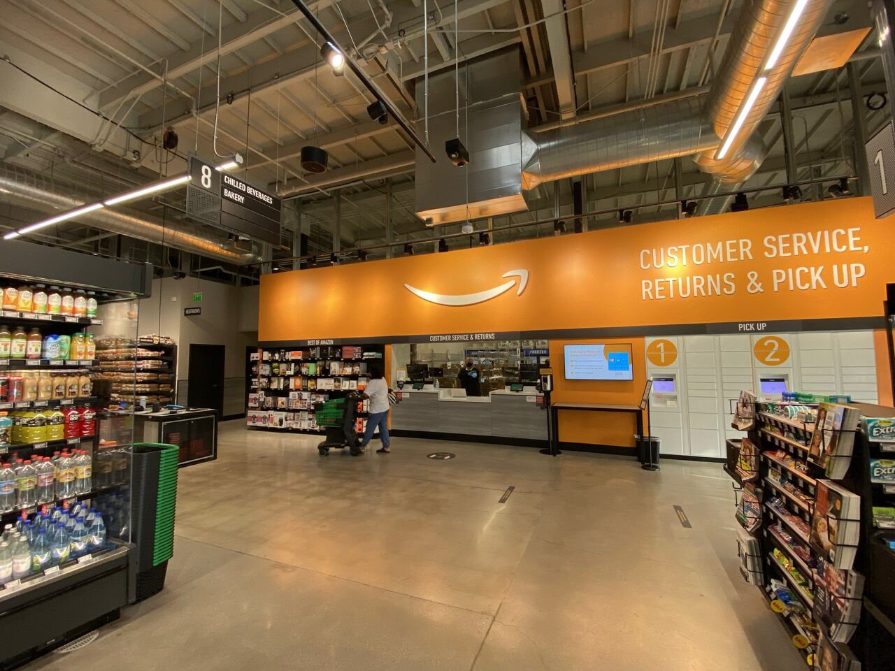 他のスーパーと最も異なる部分は入り口から右奥にあるシームレスなオムニチャネル化を実現する受付カウンター「カスタマー・サービス返品&受け取り(Customer Service Returns & Pickup)」とアマゾン・ロッカーだ。アマゾンのサイトで注文した書籍やCD、オモチャなどを窓口やロッカーで受け取れることで、スーパーで食品を購入するついでに注文品ピックアップもできるのだ。このカスタマーサービスでは返品コーナーも兼ねており、返品ではダンボールに梱包されていなくても受付カウンターで梱包してもらえる。