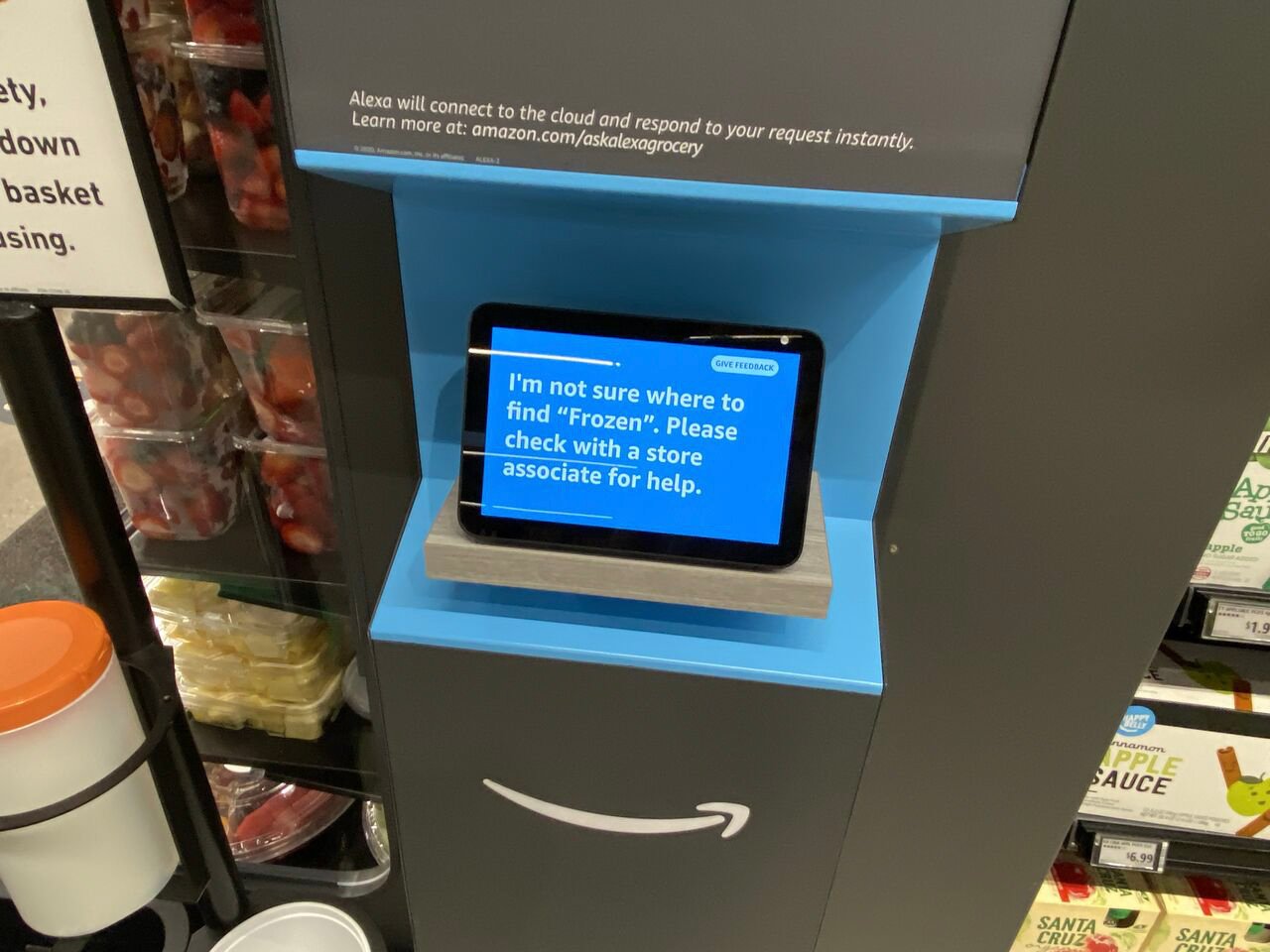 アマゾン・エコー・ショーは店内では使えないと思った。なぜならば店内のBGMがうるさく、しっかり発声しないとアレクサが聞き取れないからだ。アマゾン・フレッシュのスタッフ(ネットスーパーのピッカー係)が買い物に邪魔になるぐらい沢山おり、接客もよく親切なので彼らに聞いたほうが早いのだ。