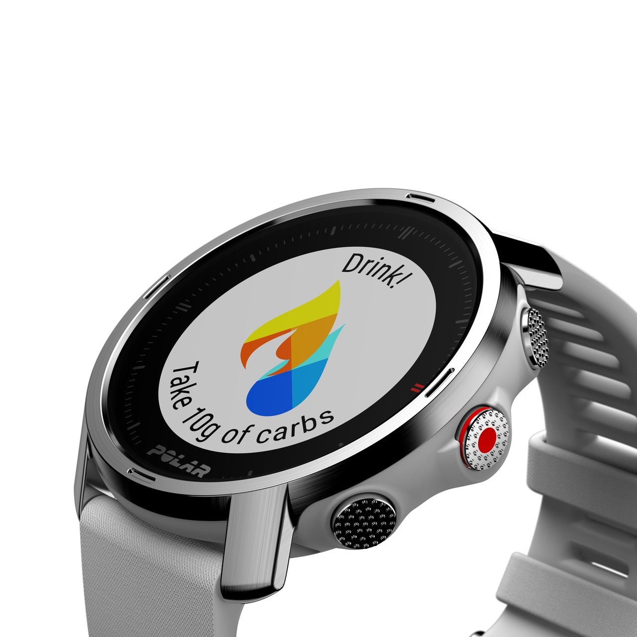 Polar Grit Xが備えている機能の中で、他のGPS搭載スポーツウォッチには見られないとてもユニークなものが、FuelWise(フューエルワイズ)という栄養補給サポート機能。トレーニング前に自分が一度に補給を考えている炭水化物の量(80キロカロリー摂取するなら20グラム)、活動時間、想定している平均心拍ゾーンを入力する。そうするとトレーニング中に必要な補給回数が算出されるので、適切な量の補給食を用意できる。そのうえで、活動中の心拍数の状況に応じて、適切なタイミングでエネルギー補給のアラート(アラーム音+振動)を出してくれる。