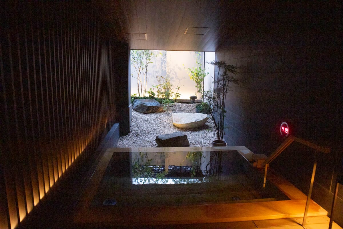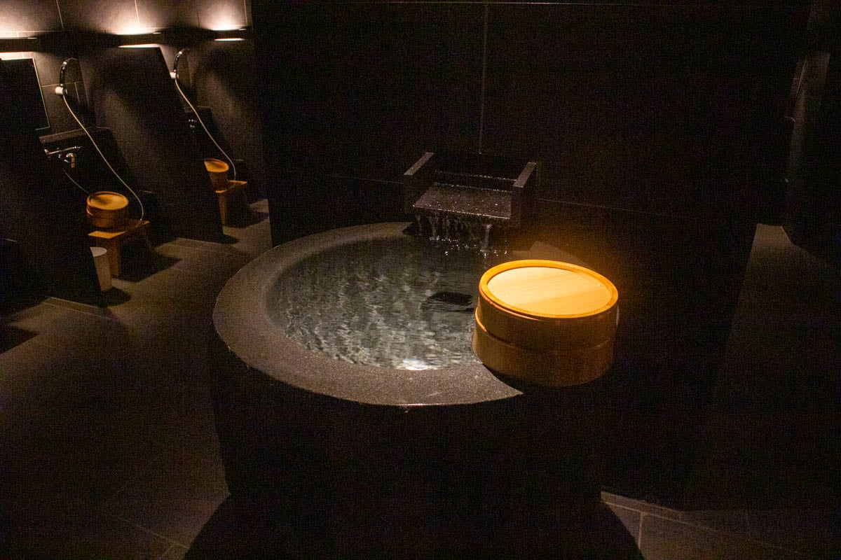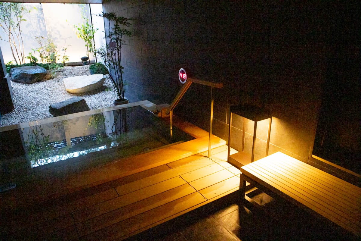 男女共通で、露天風呂には箱根にある「小田急 山のホテル」の自家源泉「芦ノ湖温泉 "つつじの湯"」を採用。富士山麓の湧水池「忍野八海」で録音した水の音を流し、リラックスできる空間を演出した。大浴場には中庭を設け、一部エリアのみ水が流れる環境音が聞こえる仕様で、外にいるような環境となっている。女湯のサウナはアーティストの和泉侃が調香した同館オリジナルのアロマを焚いたミストサウナで、男湯は一般的な乾式サウナを設置。男湯の水風呂の浴槽は御影石をくり抜いた特別なデザインとなっている。