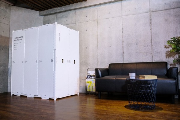 ダンボール製のコンパクトな書斎造の箱型ダンボール。作業において必要な強度と自宅のあらゆる空きスペースを有効活用できるサイズ感を両立させている。