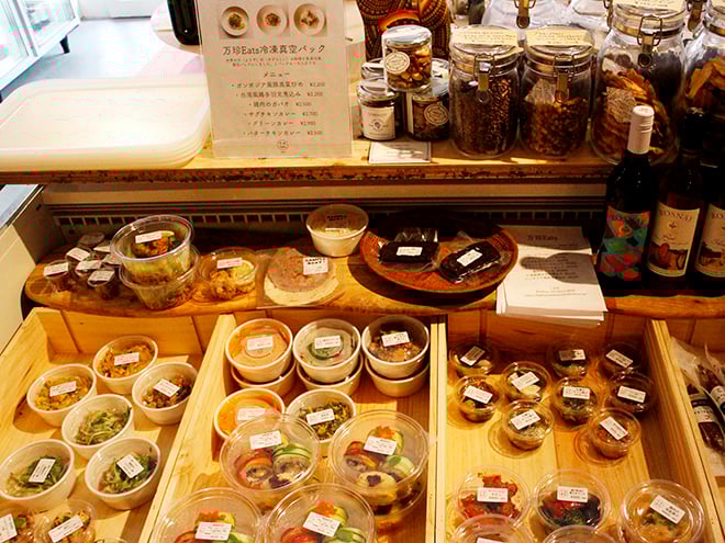 デリメニューはマリネやサラダ、生ハムなどの前菜系やおつまみ、ローストビーフやガパオなどのメインメニューまで20種以上。海老天・アボガド・とびっこなどユニークな組み合わせが楽しいメキシコの手巻き寿司「makis(マキス)」が人気だ。ほかに週一で人気カレー店「カレー屋まーくん」のカレー弁当、ウェブストアでは酒とフードの通販も展開する。