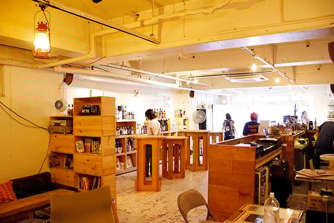 梁天井のロフト感のある開放感のある空間は、元「PREFAB Gallery and Things naijel graph(プレハブ ギャラリーアンドシングス)」(プラスチックスの故・島武実さん、DEPTの創業者永井誠治さんが営むギャラリー)があった場所。もとの空間を活かし、仲間の大工が作ったバーカウンター、DJブースや棚、テーブルなどを配置し、買い付けで見つけた雑貨やオリジナルグッズの買い物もできるラウンジコーナーを併設した。