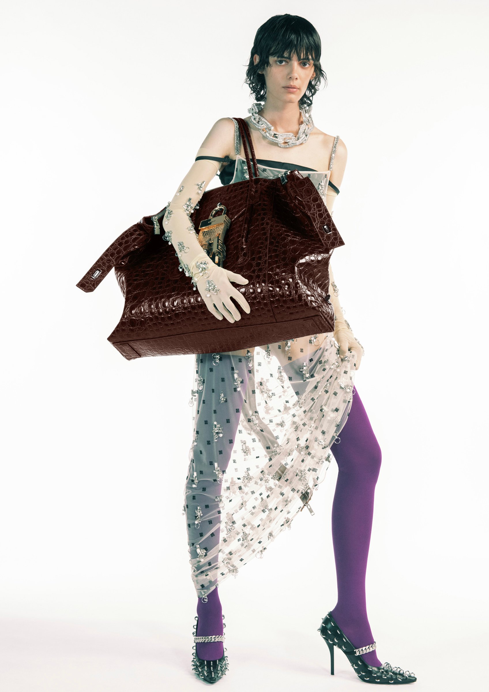 アクセサリーでは極太のチェーンが目立ち、再解釈された「アンティゴナバッグ」や新作の「カットアウトバッグ」は幅広いサイズと素材で展開されている。ウィリアムズならではのスポーティーなボディバッグはレザー素材でラグジュアリーに。シューズでは、3本指の動物の足(=tripedal)を模したという「トライプ・ トゥシューズ」とストッキング、そしてソールに厚みのある「マシュマロ・スライド」といったアイコニックなアイテムが揃う。