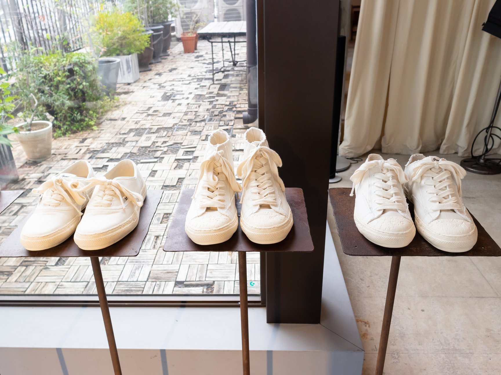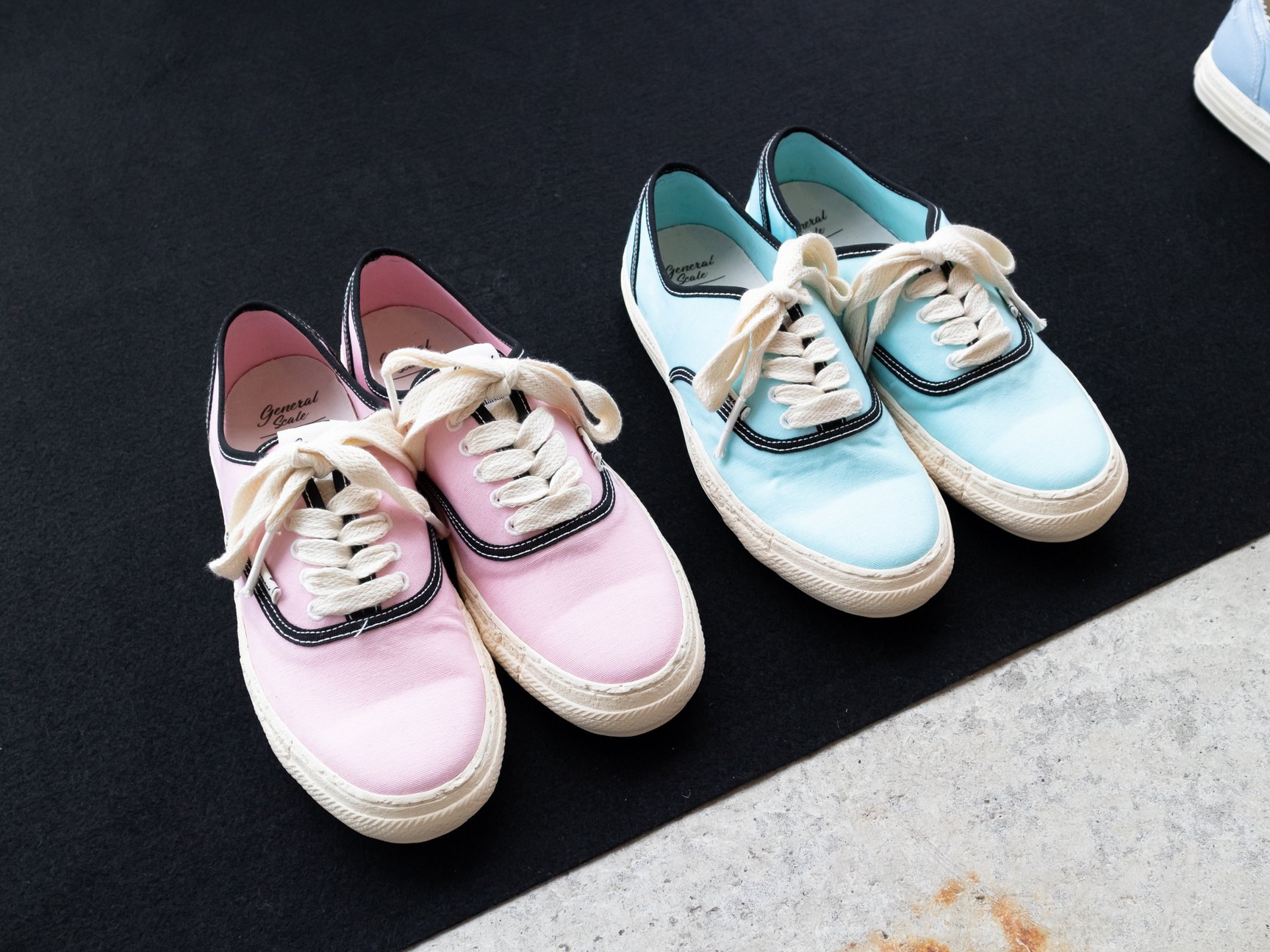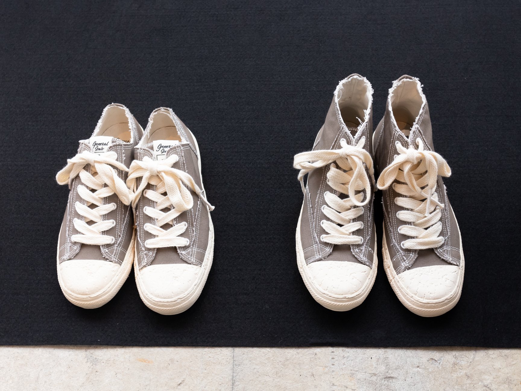 ジェネラル スケールは「土に還るスニーカー」をコンセプトに、ソールからアッパー、ミシン糸までスニーカーを構成する全てのパーツに生分解性の素材を使用。アッパーのテキスタイルやシューレースにはオーガニックコットンを使用し、ステッチも同素材の糸であしらった。ソールは天然ゴム、インソールは100%植物繊維素材のラテックスで製作。デザイナーの三原康裕がミリタリーショップで経年劣化などにより着用できなくなったヴィンテージのコンバットブーツを見た際に「履けるヴィンテージの靴を作りたい」と思ったことから、経年劣化で朽ちたゴムやすり減った踵を再現した「PAST」を新たに開発し、成形は全て手作業で行った。ハイカット1型(3万7000円)とローカット2型(各3万5000円)を展開し、36〜45のサイズを用意する。