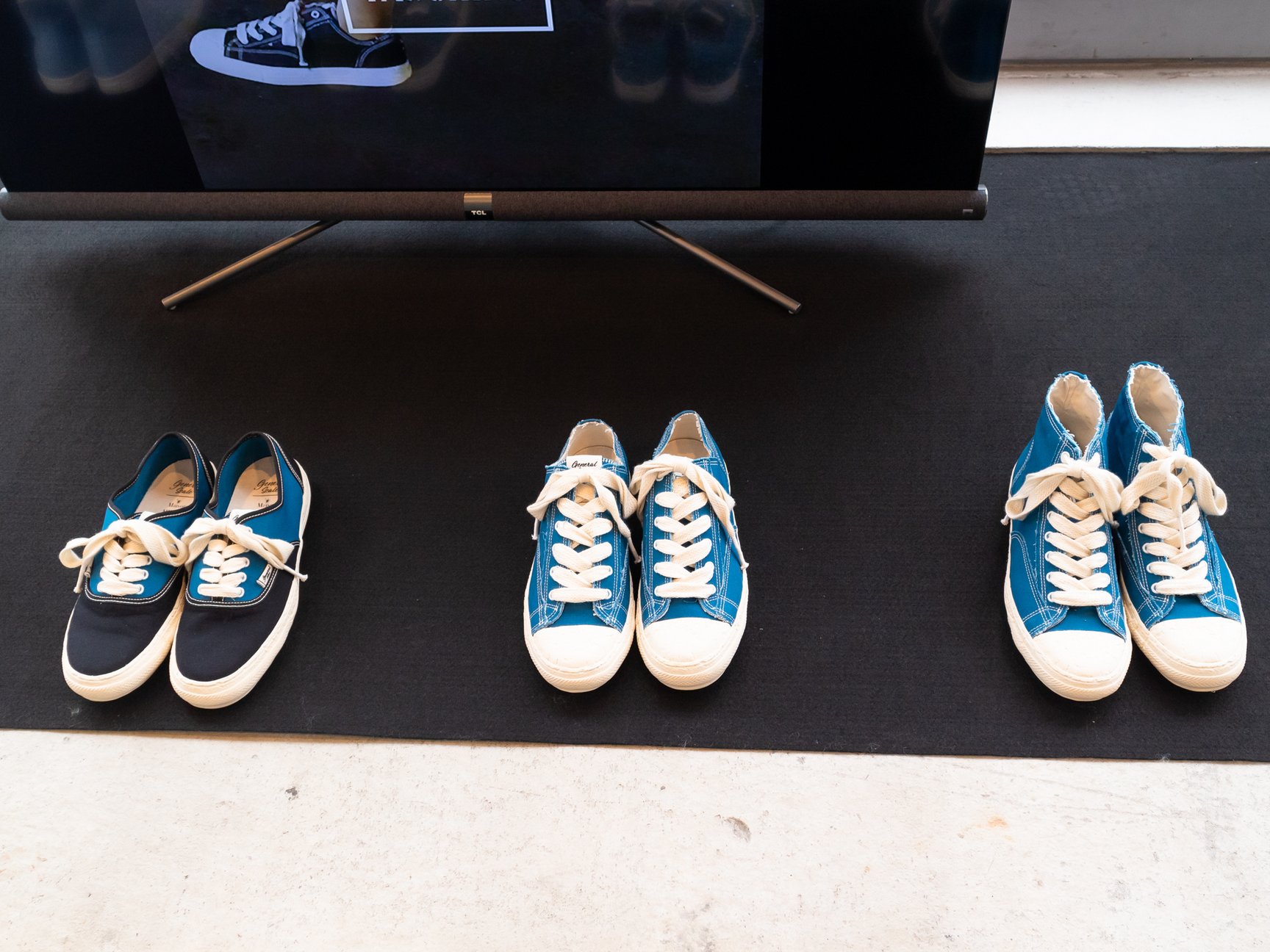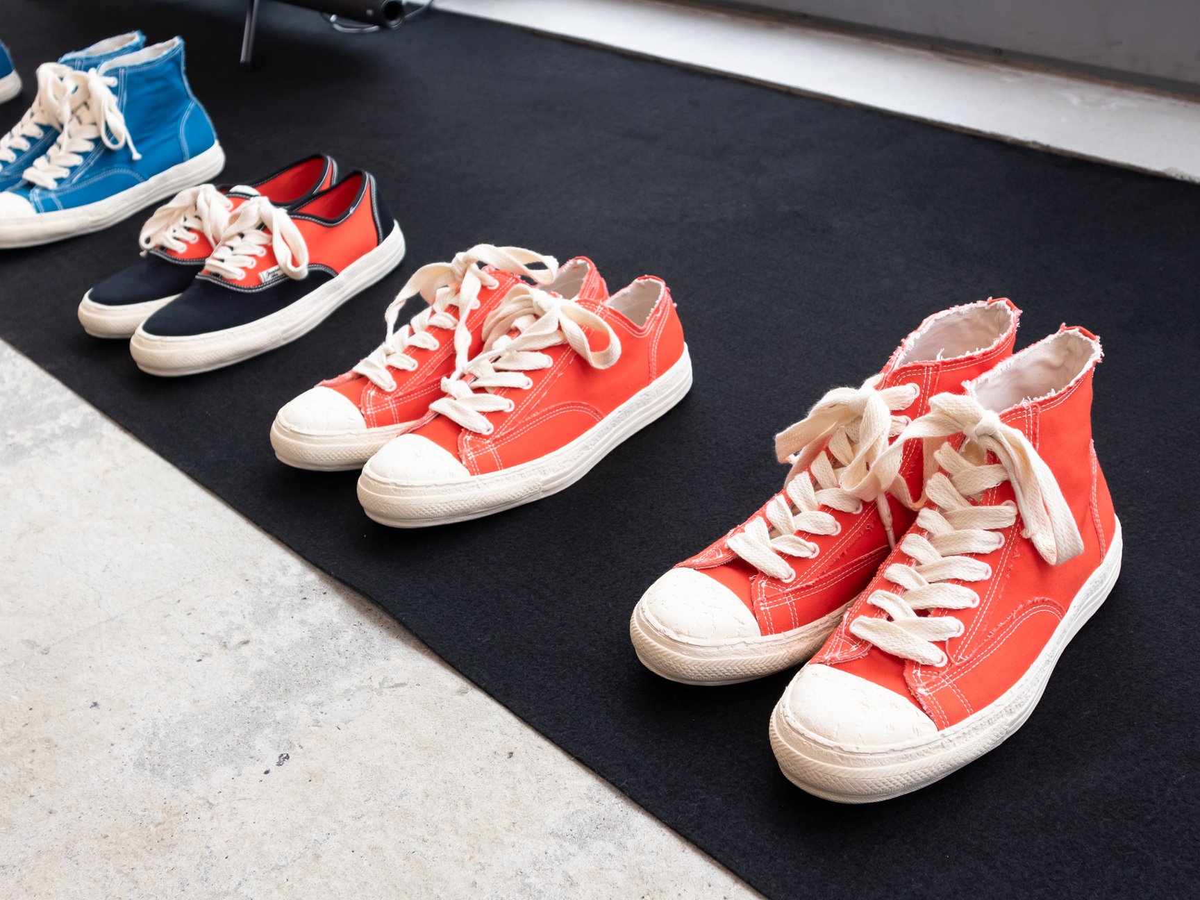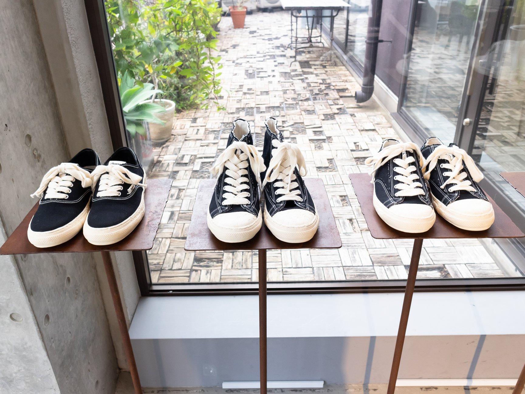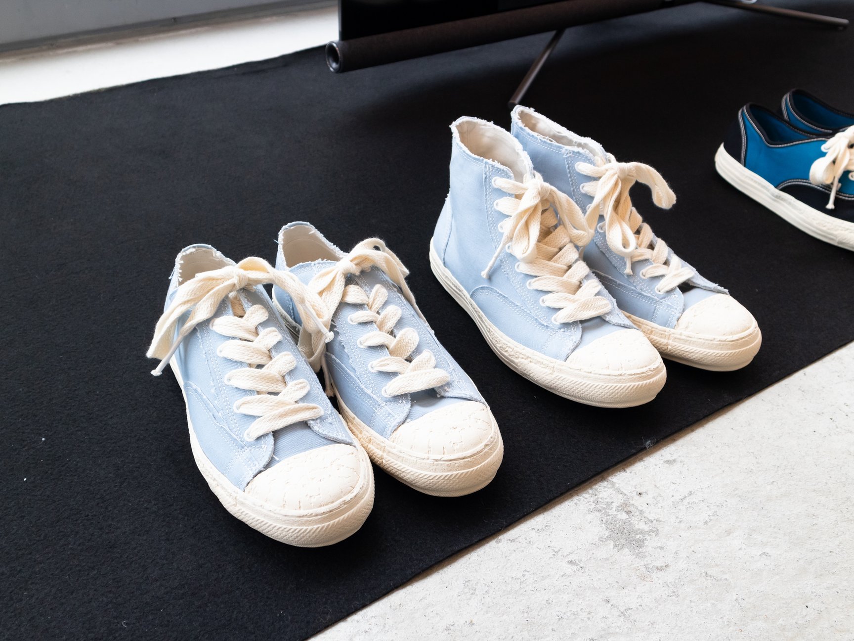 ジェネラル スケールは「土に還るスニーカー」をコンセプトに、ソールからアッパー、ミシン糸までスニーカーを構成する全てのパーツに生分解性の素材を使用。アッパーのテキスタイルやシューレースにはオーガニックコットンを使用し、ステッチも同素材の糸であしらった。ソールは天然ゴム、インソールは100%植物繊維素材のラテックスで製作。デザイナーの三原康裕がミリタリーショップで経年劣化などにより着用できなくなったヴィンテージのコンバットブーツを見た際に「履けるヴィンテージの靴を作りたい」と思ったことから、経年劣化で朽ちたゴムやすり減った踵を再現した「PAST」を新たに開発し、成形は全て手作業で行った。ハイカット1型(3万7000円)とローカット2型(各3万5000円)を展開し、36〜45のサイズを用意する。