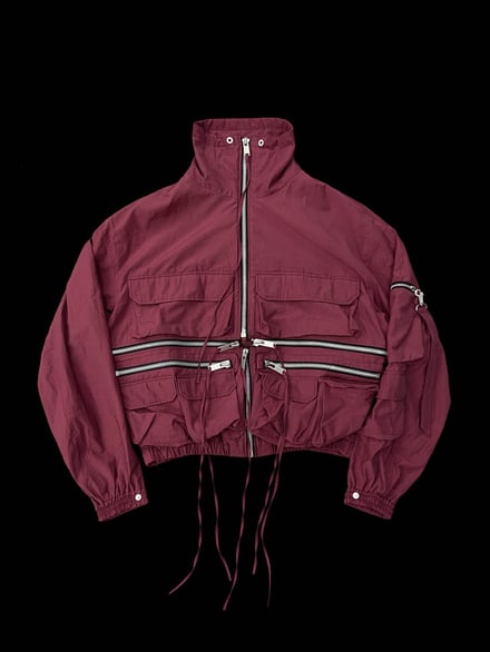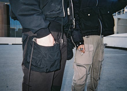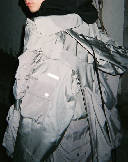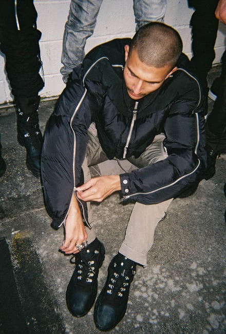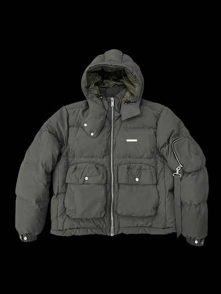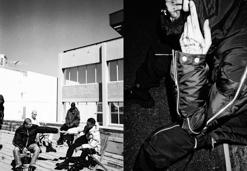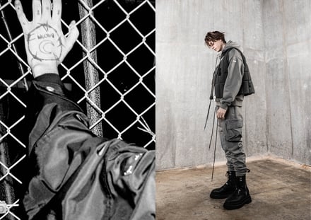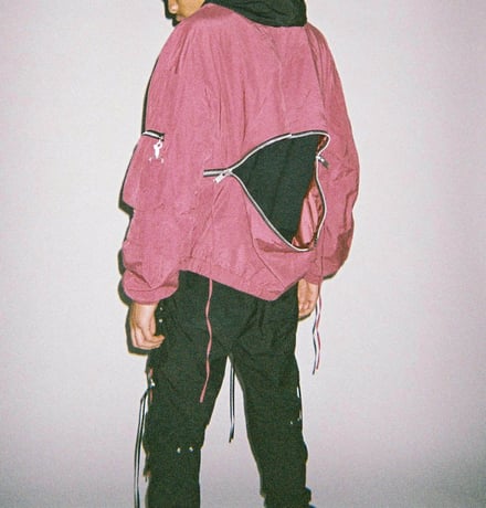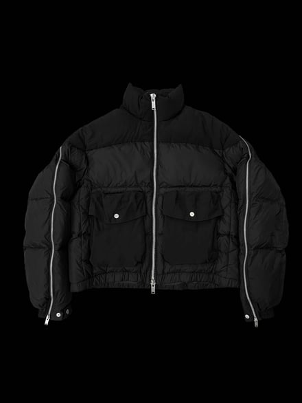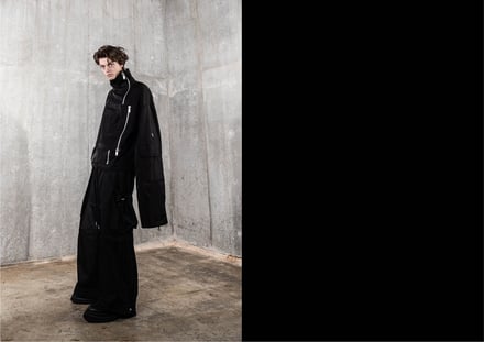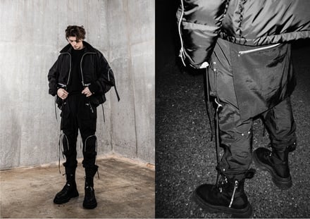 ダウンジャケット(15万5000円)、ベスト(8万4000円)、フライトボンバージャケット(15万円)、カーゴパンツ(6万4000円)、オーバーサイズのスキージャケット(12万)のほか、フーディ(4万3000円)、Tシャツ(2万6000円)、ミリタリーブーツ(6万8000円)、ニット帽(1万5000円)などヨーロッパのミリタリーウェアからインスピレーションを得たアウターやボトムス、Tシャツやフーディ、アクセサリーなどを揃える。ポケットや紐のディテールを多様に取り入れ、モードでエッジの効いたデザインに仕上がっている。