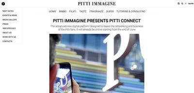 ピッティ・イマージネ・ウオモは、世界最大規模のメンズウェア見本市として年2回開催され、世界各国から毎回3万人以上が来場している。2020年6月に開催予定だった夏のトレードフェアは新型コロナウイルス感染拡大の影響で延期し、一部のイベントを除いてリアルでの開催を中止。7月16日から10月9日まで独自のデジタルプラットフォーム「ピッティ・コネクト(PITTI CONNECT)」を用いて展開している。