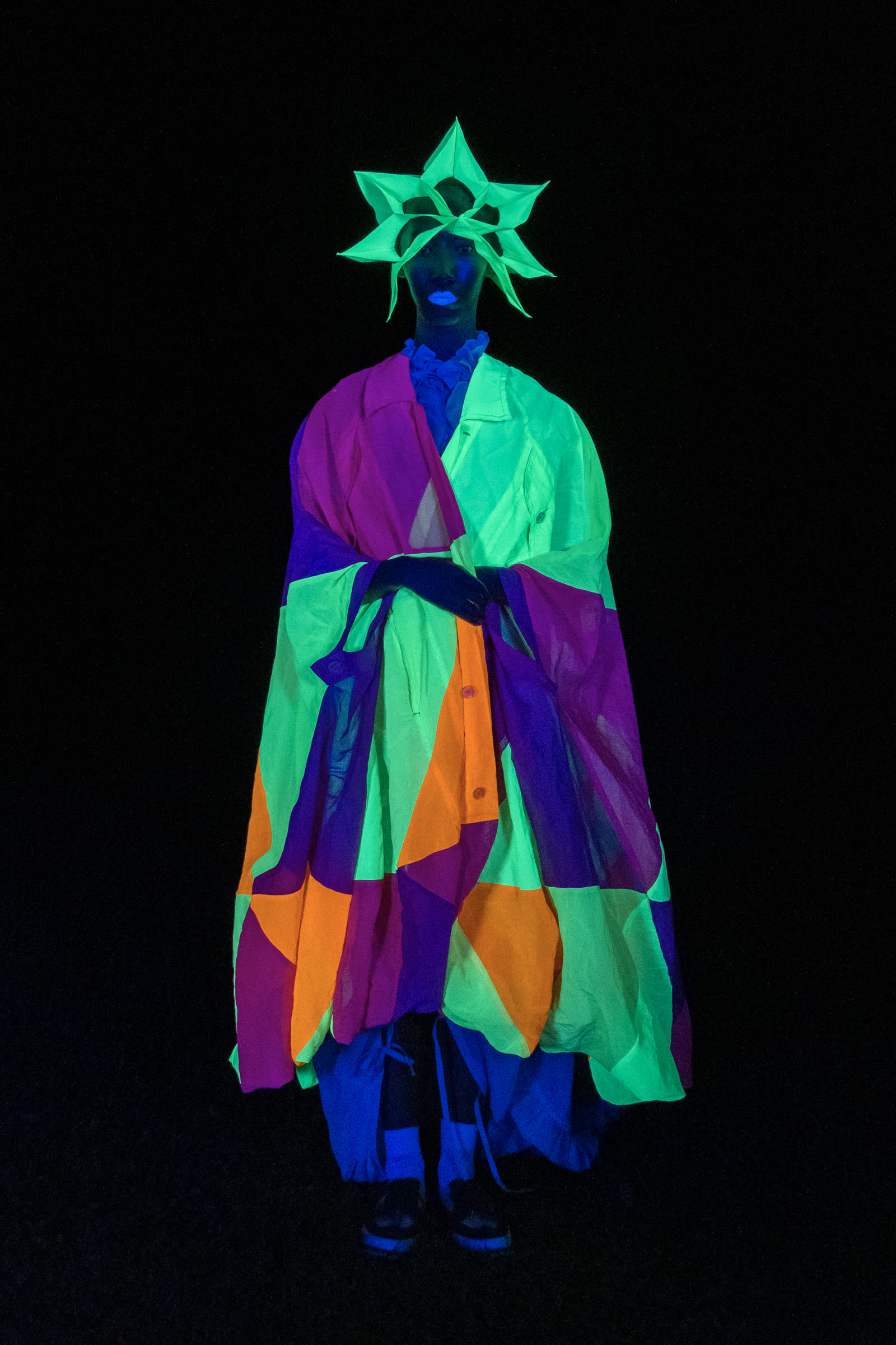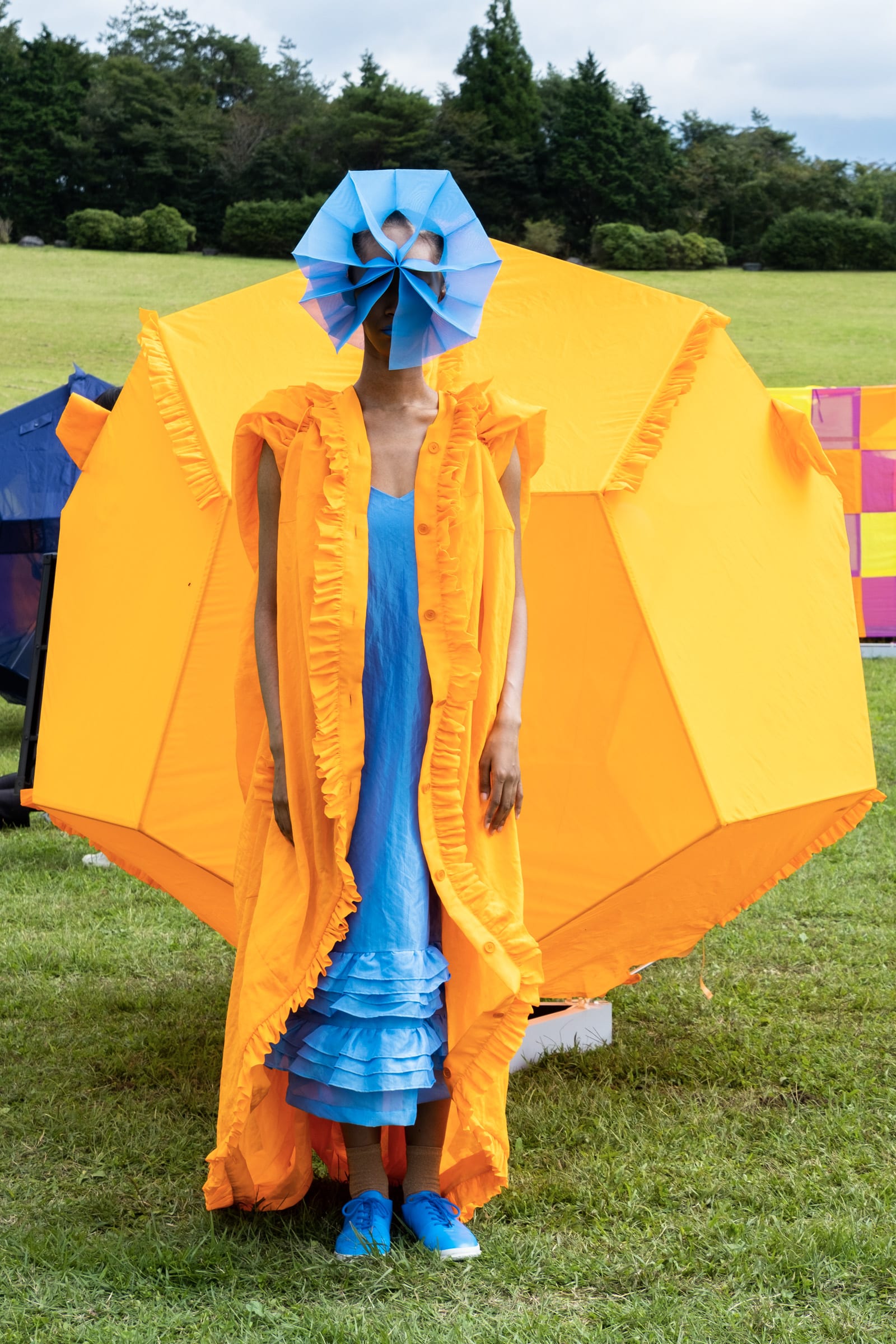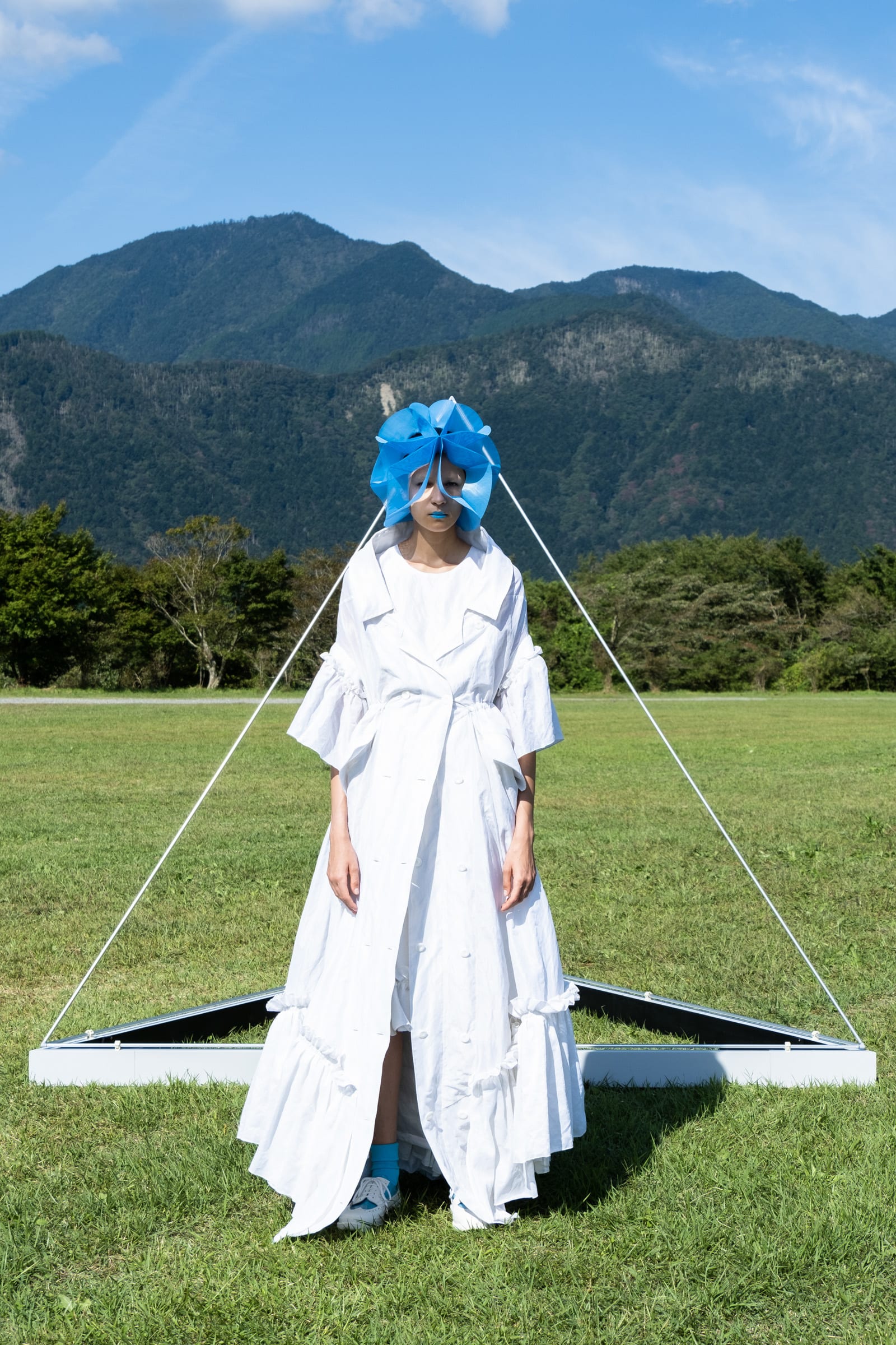 森永が作る服には、遊牧民の持つ土臭さはない。垢抜けのしない容姿が、生命力の強さを誇示する遊牧民に比して見れば、寧ろ森永の服は洗練され、綺麗でさえある。「家のような服」「服のような家」と云う副題が添えられている。骨格を入れると2メートルのパーソナルスペースを確保し、空間に変化するが、骨格を外し、ドローコードでギャザーを寄せて括ることにより、空間は服に変わると云う設計。過去に発表した「○△□」(2009年春夏)と「BONE」(2013年春夏)の発想を巧みに発展させ進化させている。動画を見ると、開放感のある大地に映える発色の強い色彩が眼に飛び込んでくるが、これは「BONE」の時の配色である。