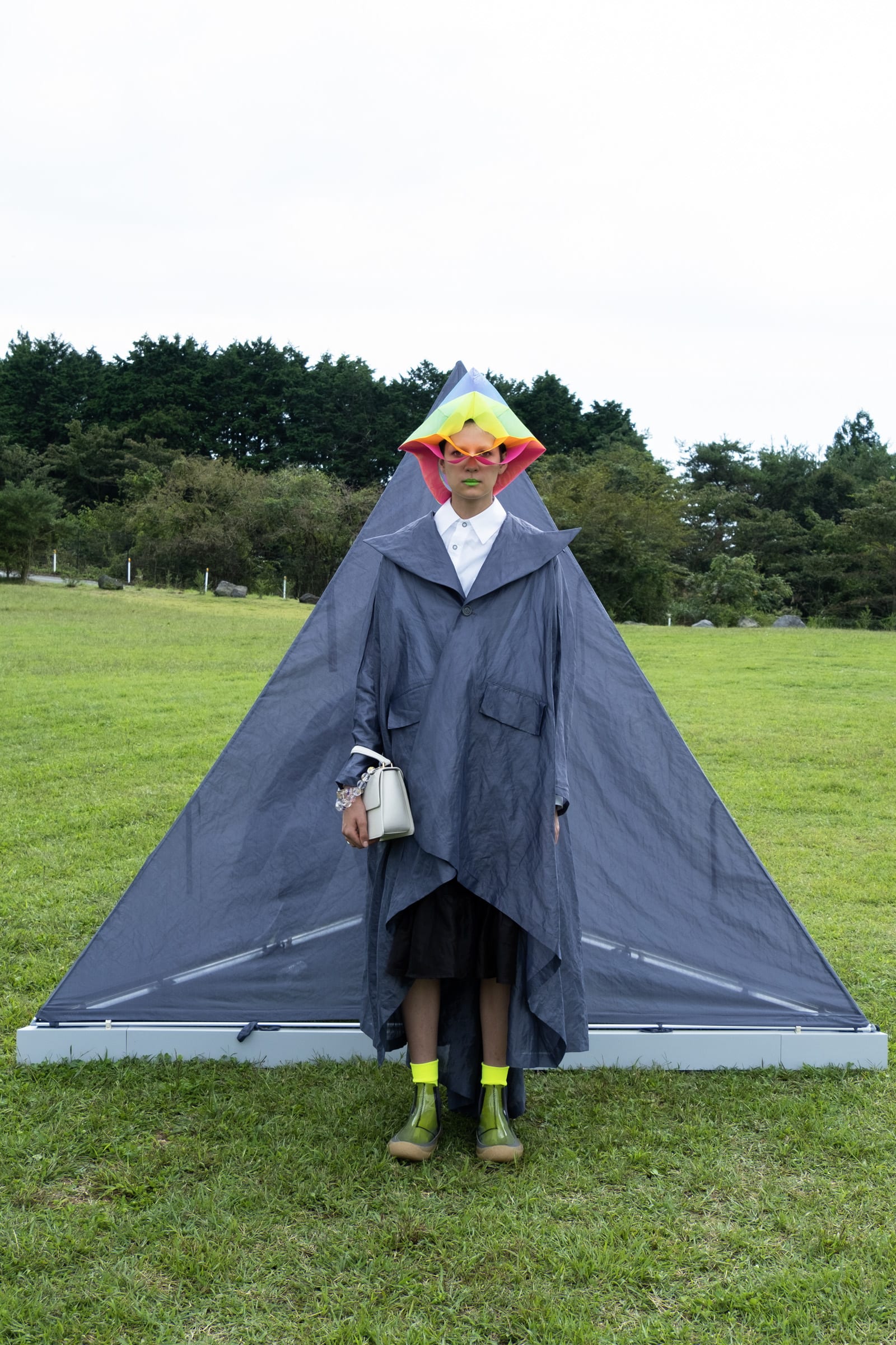 どうやら人間の想像力は、或る物体が一定の大きさのままに留まっていることに、いっかな満足しないようである。想像力は常に、対象の急激な拡大と縮小を可能ならしめるところの、不思議の国のアリスが飲んだ水薬のようなものを欲しがっている。周囲の評価を気にする程度に神経質で、愛他精神と利己主義を兼ね備えた即物的センチメンタリスト。これは最近の私の森永評である。揶揄や否定的な意味はない。また彼には、己顕示欲の強い一面と隠者的な一面があるが、いずれにしても、ラジカルへの陶酔は覆い隠し難いものがある。とりわけ今回は、これまでの創作過程を度外視したら生まれてこない面白さが戻ってきている。そもそも「神は細部に宿る」の題目を唱え、膨大な時間を掛けた手仕事に、尋常ならぬ情熱を注ぎ込んでいたブランド初期の創作は、回を重ねる度に重苦しく見えてきた。マンネリズムに嵌った丁度その時分、森永は起死回生の「○△□」コレクションを発表して、文字通り新たな境地を拓いたのである。これまで番度見てきたが、如何に発言するかと云う方法論(トゲのある形容だけれど、奇術師が見せるトリックのような仕掛けは、森永独特の修辞表現なのだけれど)に固執するのも良いが、今回は、何を発言するかと云う思想とか、問題提起に重きを置いた観が強い。誤解を招くかも知れないけれど、パンデミックの影響が効果覿面に影響して、彼なりに現実を直視することが出来たのだろう。これ迄が実験的過ぎたから、まだ色眼鏡で見る人もいるかも知れない。また、服=家の発想は新しいものではない。だが、今回のファンタジーは、時節も手伝ってか「幸福感」に満ち溢れていたと思う。(文責/麥田俊一)
