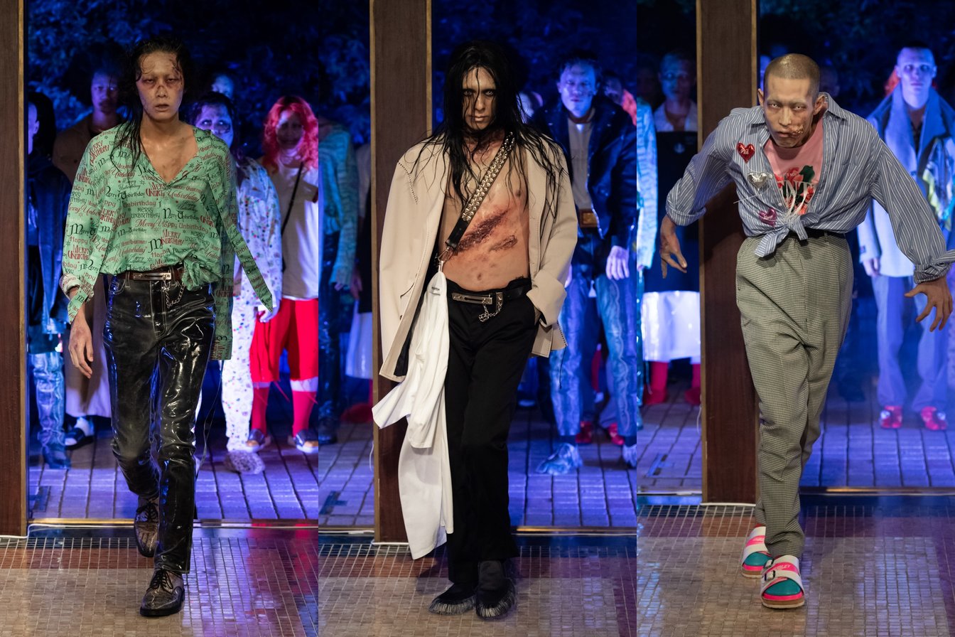 まず、ゾンビたちの響宴(狂宴?)をテーマに、謎の館の中で繰り広げられる様子を楽しみながら映像を鑑賞。登場するのが、プロのモデル&一般人で、メーキャップと特異な動きで、全員がゾンビに見える。寺山修司ばりの物語で、いちばん注目したのは、ここでゴシックなどの装飾性を排した服が選ばれていることだ。服の着方はなにせゾンビだから、めちゃくちゃなんだけど、そこがスマートなショーとは一味も二味も違う奥深さで、これが単なる新作発表を旨とするコレクションだというところに、ファッションのおもしろさを感じたものだ。