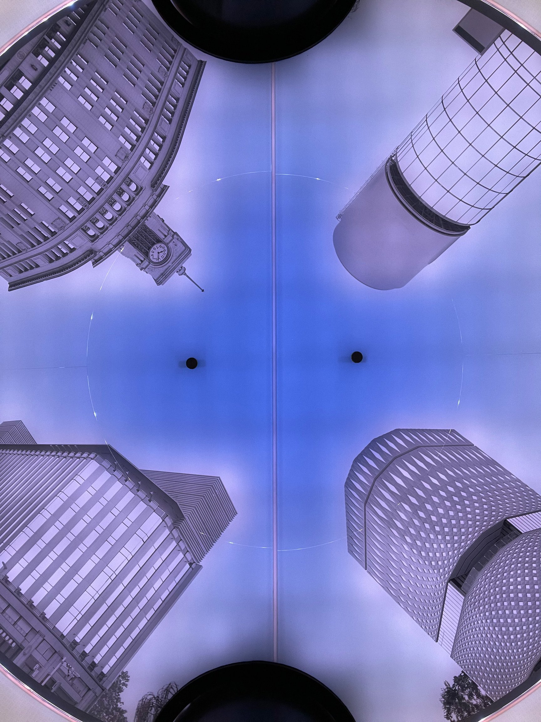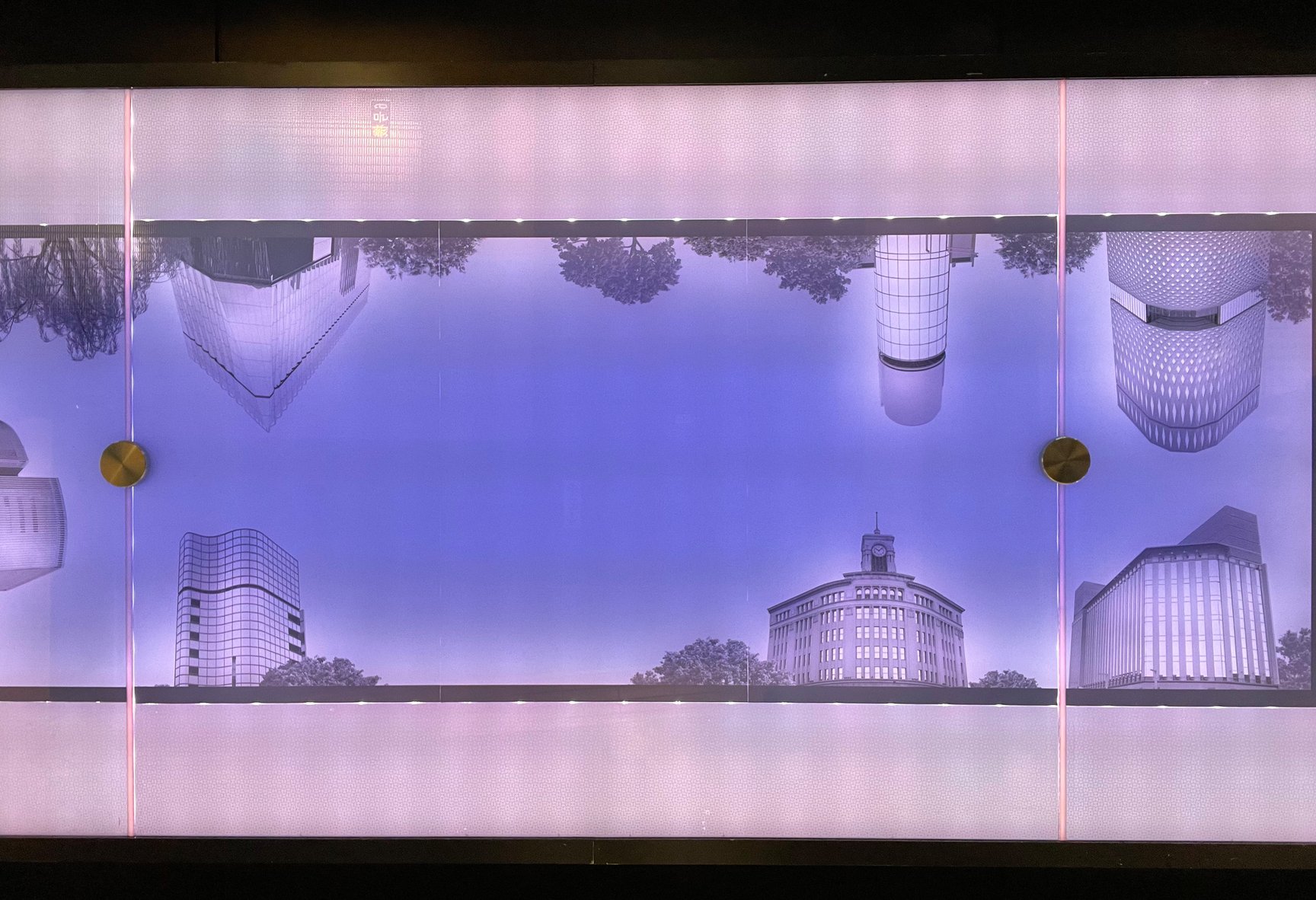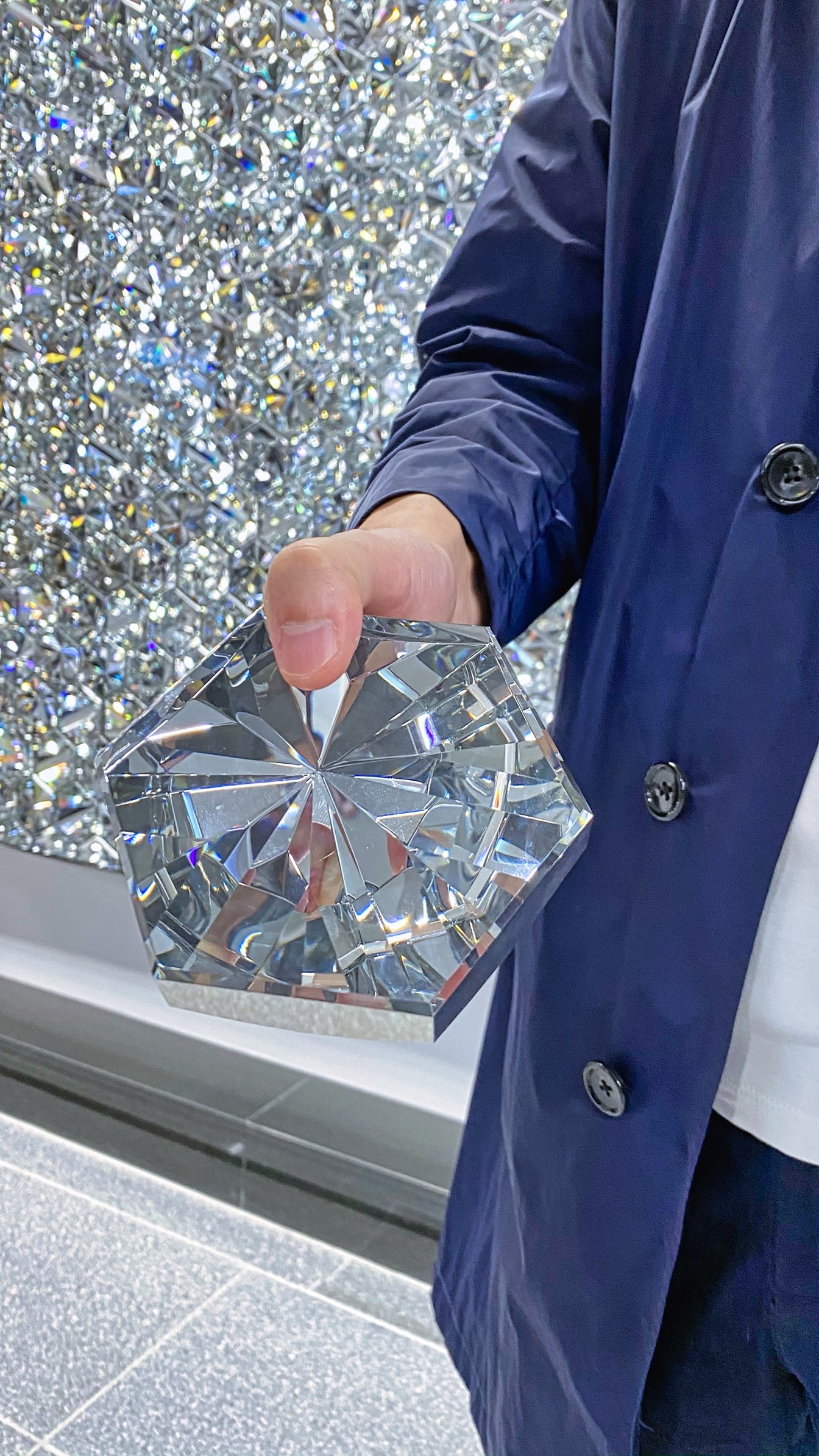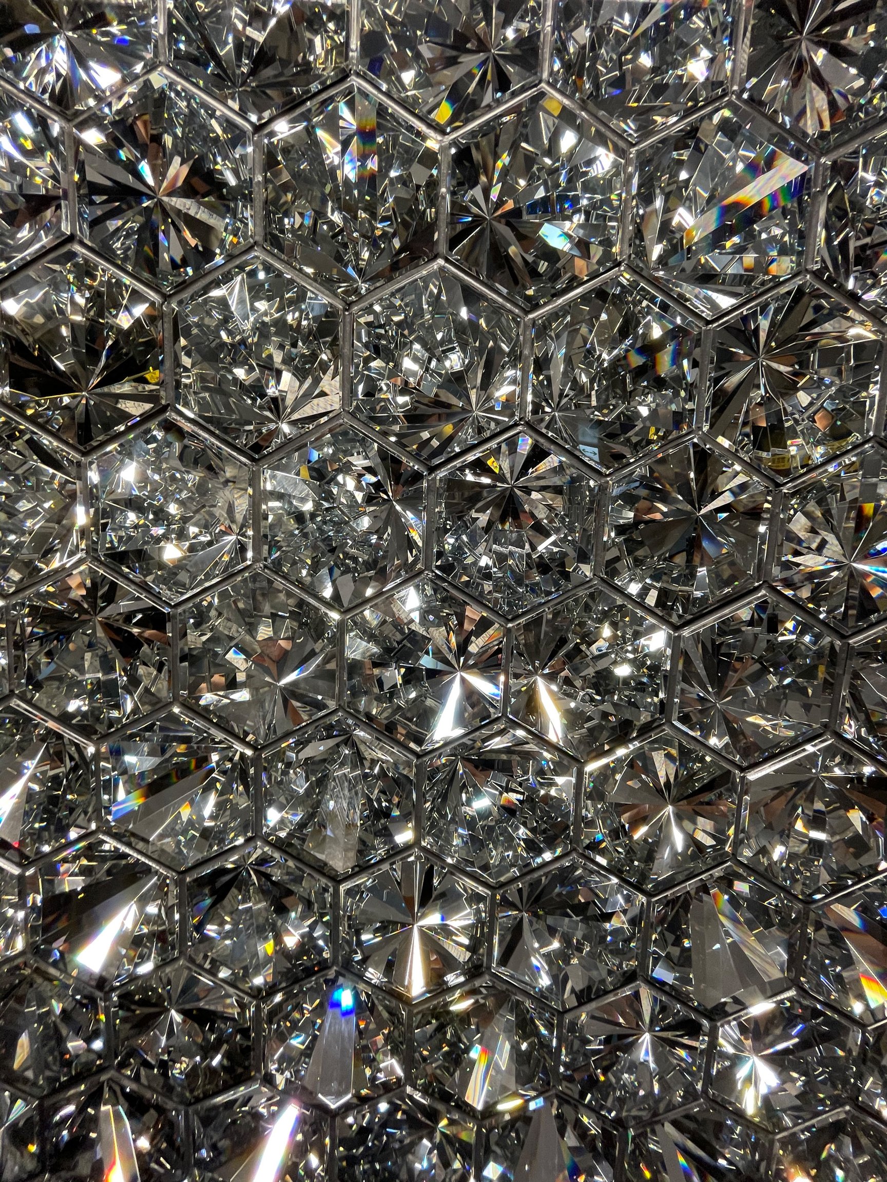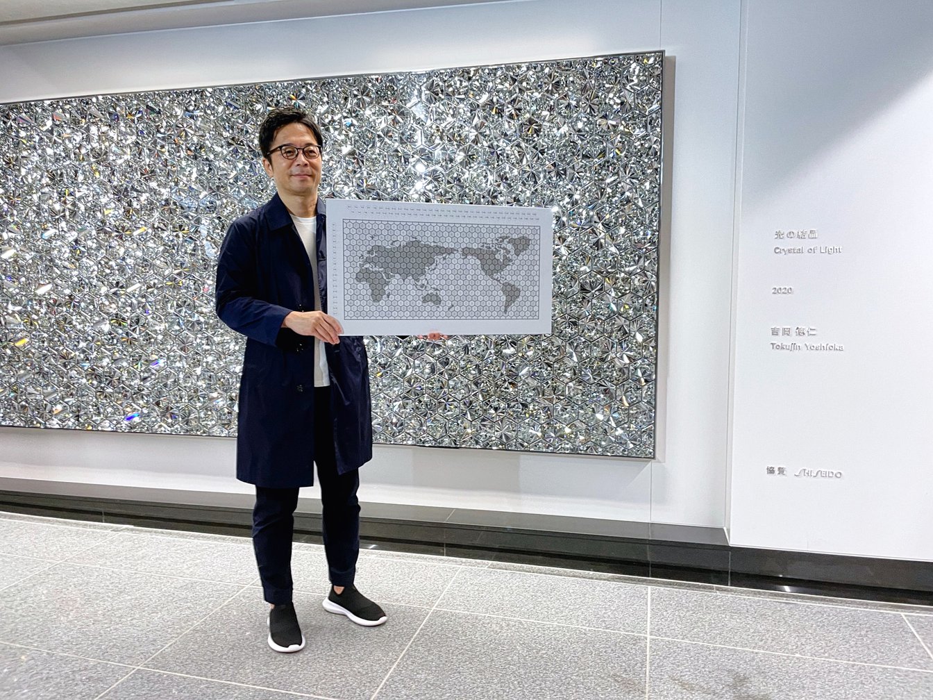 「地球に生きるものとして世界がひとつになる」という平和への願いを込めた同作。クリスタルはいくつか形のパターンがあり、これを並べるときに、メルカトル図法の日本でお馴染みの世界地図をモチーフに配置を考えたというもので、目を凝らしても世界地図が浮かび上がってくるわけではないが、背景を聞いて一つ一つのきらめきが世界中に散らばったステキなことに取り組んでいる人たちのようにも感じられた。