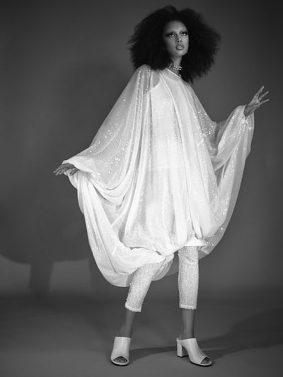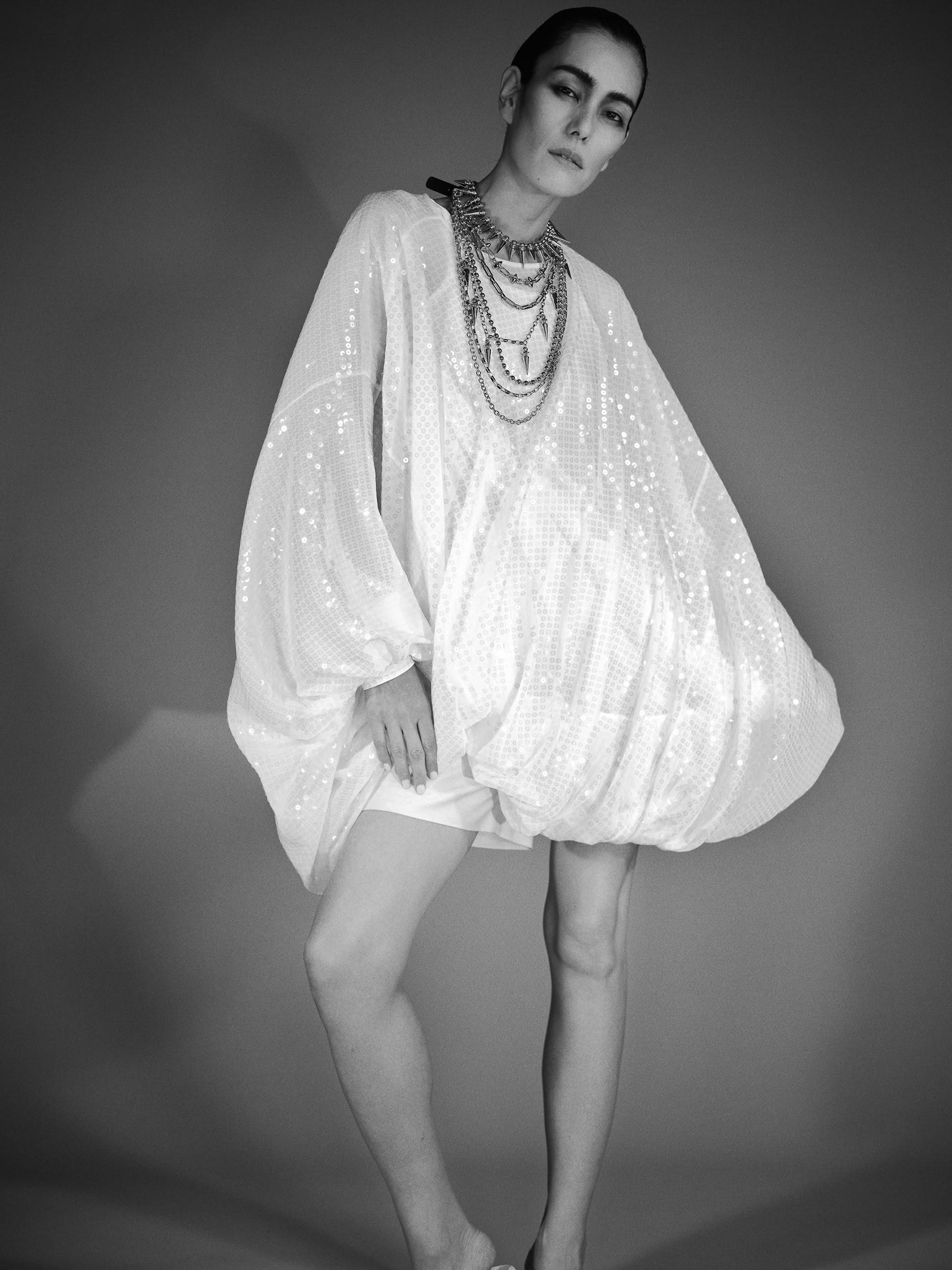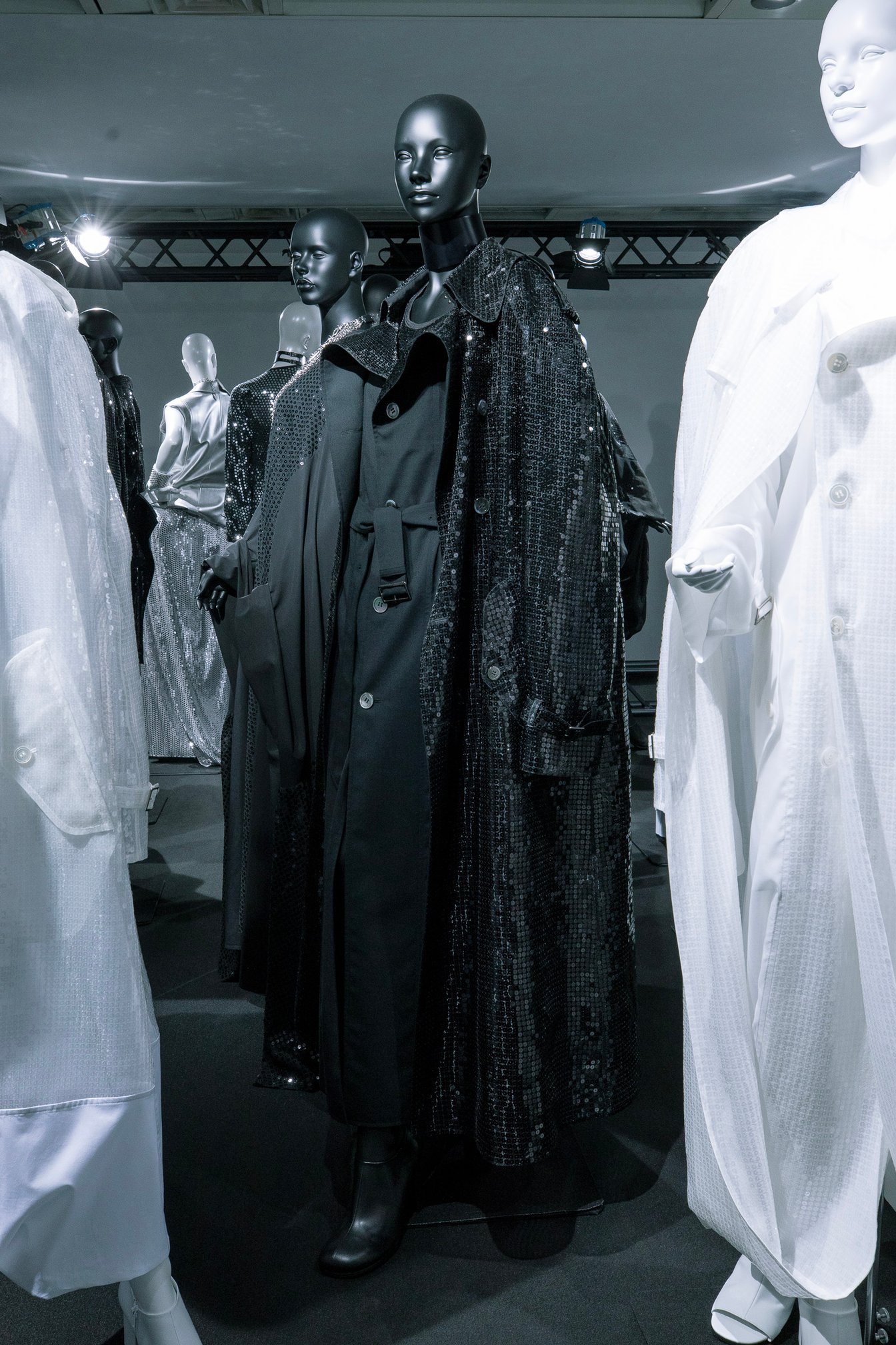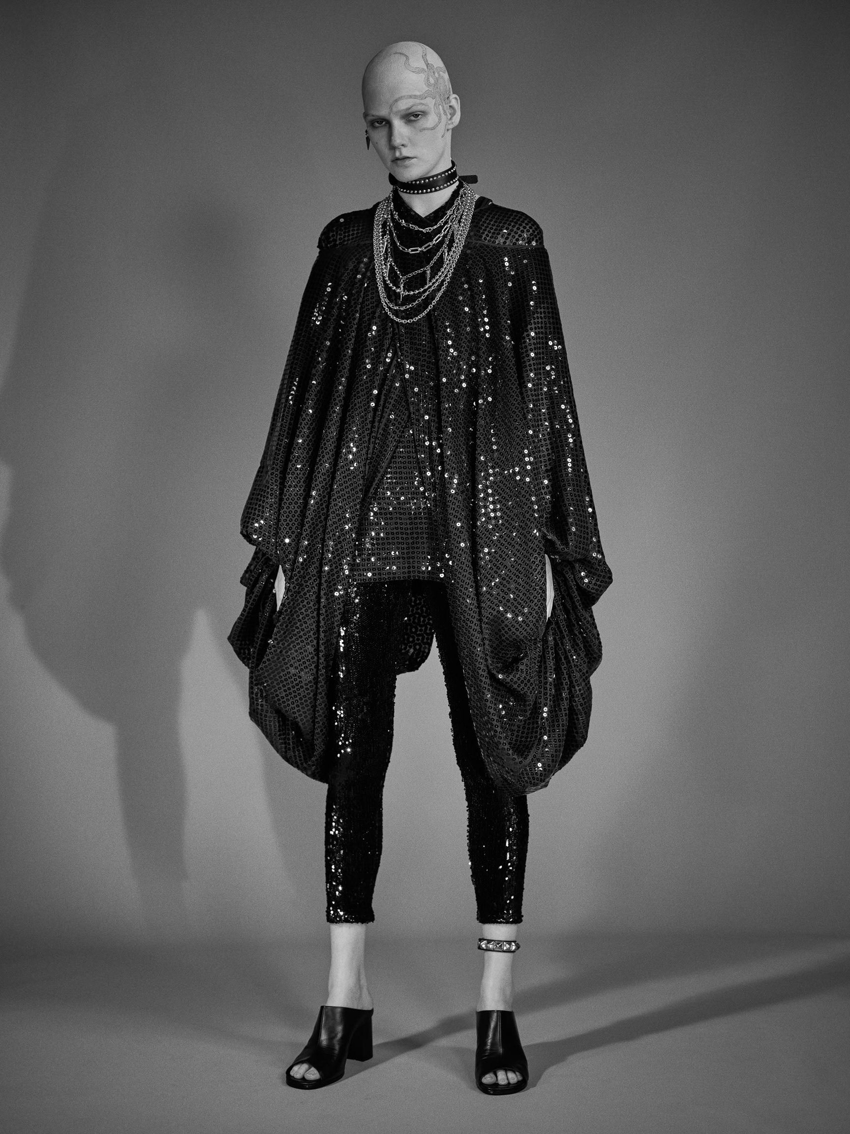 白と黒のみで構成されたコレクションは、古代ローマに着用されていたトーガのようにドレープが流れるドレスにはじまり、ライダースジャケットやトレンチコート、パールとスタッズを組み合わせたネックレスなどが揃い、ほぼ全てのアイテムにスパングルを施した。2020年春夏コレクションで焦点を当てたブランドアイコンのひとつであるトレンチコートは、裾で折り返し、布帛とスパングル地といった2枚が裾で繋がりレイヤードさせるといった、存在感のある一着に仕上げた。