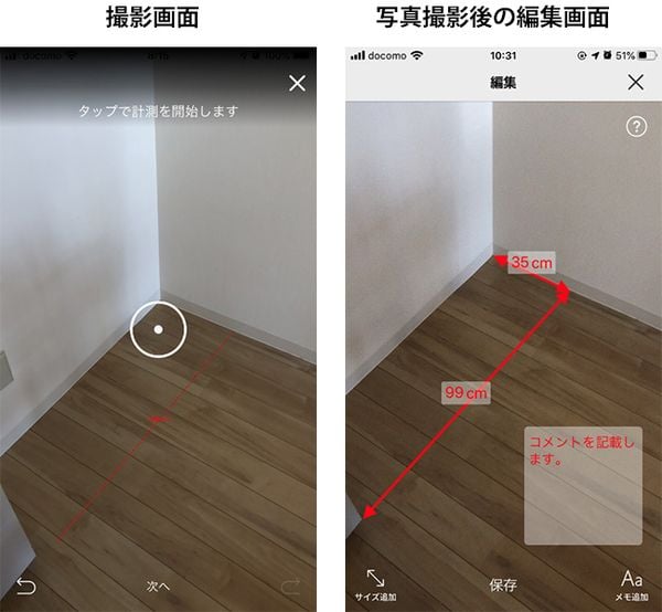 株式会社NTTドコモの新規事業型子会社である株式会社ロケーションバリュー(以下、ロケーションバリュー)は、スマートフォンアプリ向けSDK「measAR note(メジャーノート)」を開発。家具・家電のサイズ計測に加え、メモや画像保存にも対応している。