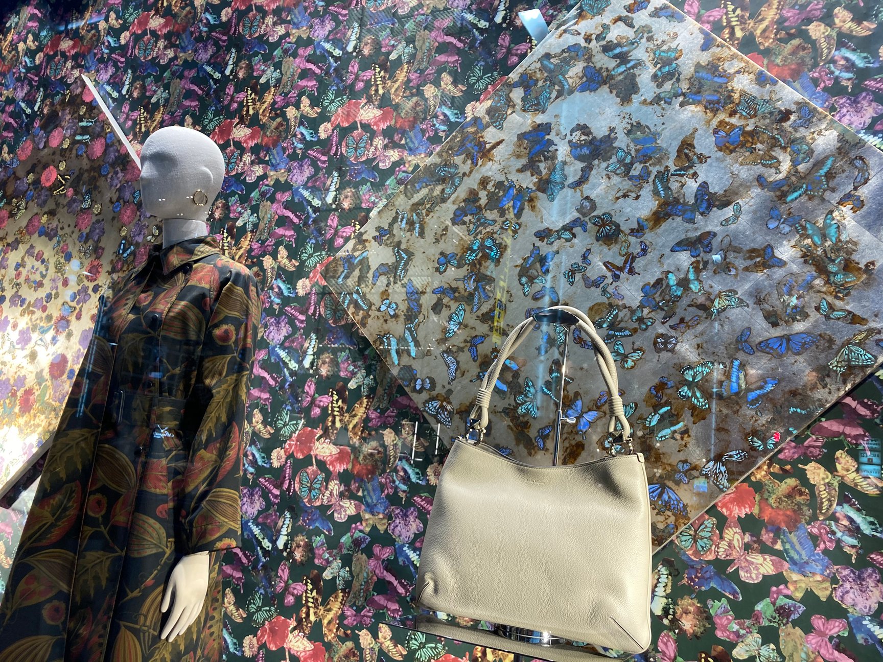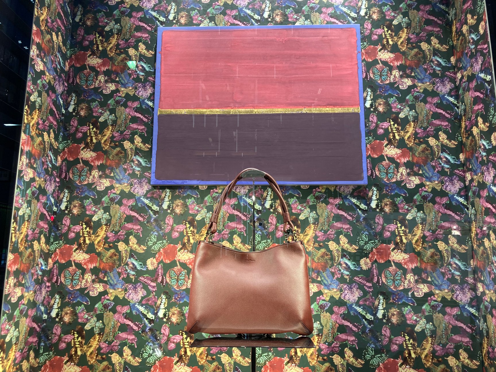 銀座駅A2出口から徒歩3分の場所に位置する「サルヴァトーレ フェラガモ(Salvatore Ferragamo)」の銀座本店のショーウィンドウには、フェラガモの新作コレクションと共に現代日本画家 大竹寛子の作品がディスプレイされています。日本画の伝統的な技法を基に、箔や岩絵具を用いて現代絵画として新な表現を展開する大竹の作風は、「伝統と革新」を追求するサルヴァトーレ フェラガモの精神と共鳴し、今回のコラボレーションに至ったそうです。