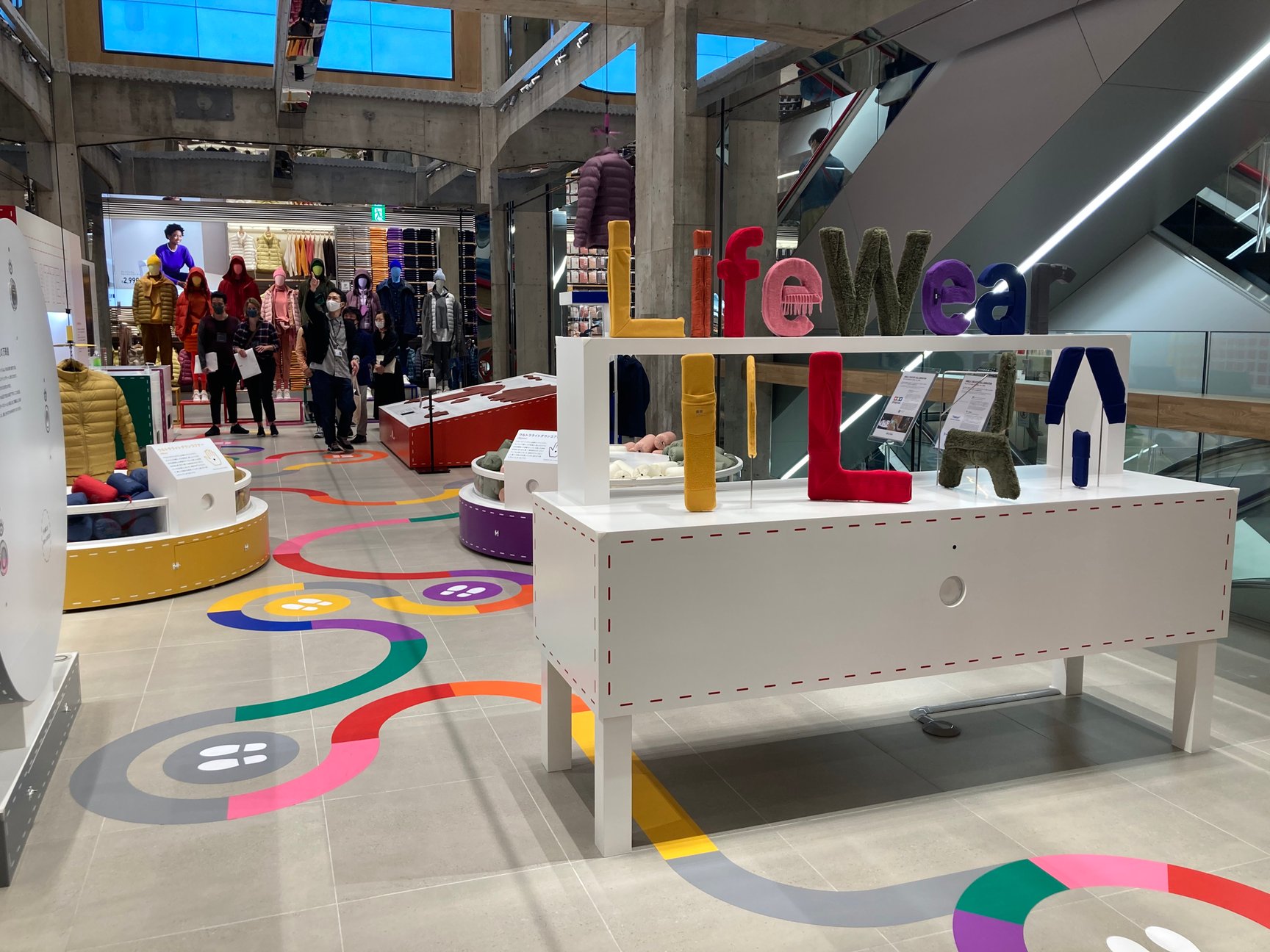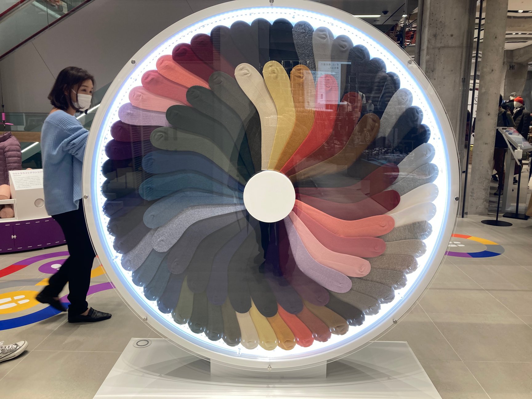 6月にオープンした国内最大級のグローバル旗艦店UNIQLO TOKYOの1階では「LifeWear PLAY」を開催。50色のソックスを万華鏡に用いた作品や、様々な生き物のために作られた3Dニットなど、アートユニットplaplaxとコラボレーションしたインタラクティブな7作品が展示されています。