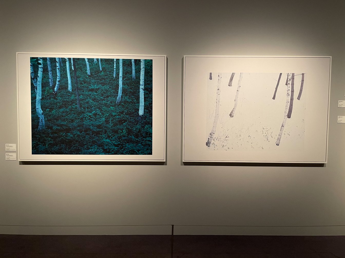 中央には瀧本幹也さんが長野県小諸市にある「ルイ・ヴィトンの森」の夏と冬を撮った作品。日本の豊かな自然を絵画的かつ繊細な形で捉えた作品だ。友人で本展のアートディレクターを務める柿木原政広さんに言われて気がついたが、作品の上下の余白の幅までこだわって調整されている。