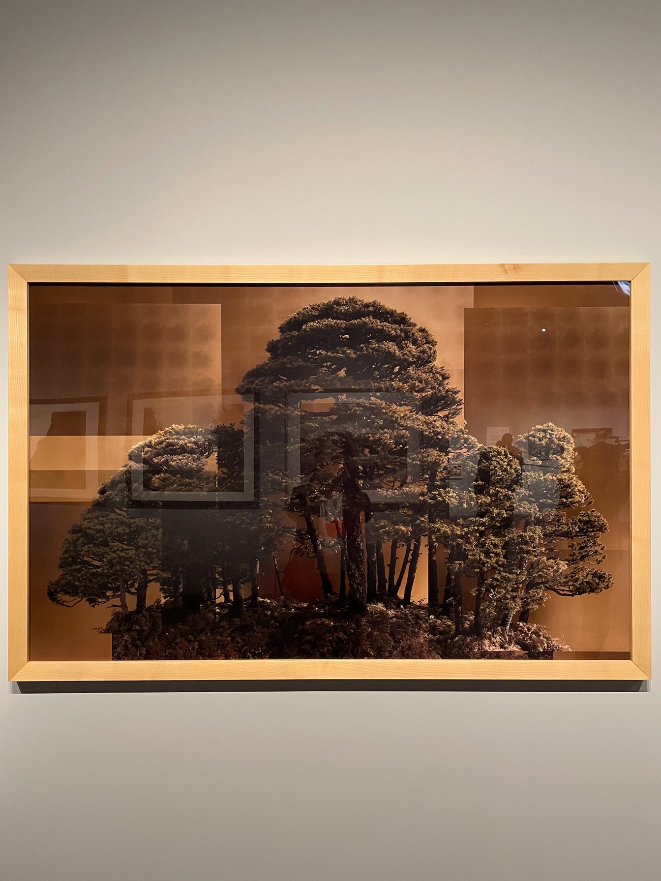 本展覧会で、もっとも見応えがあるのは、次の第4章「花鳥風月」という章で、菅原一剛さんの椿の湿板写真(裏地にはベルベットを使用)で始まり、隣は大和田良さんが、500年以上生きてきた盆栽を1年以上の時間をかけて撮り合成した写真、香港のセリン・ウーさんの樹木の影を人間国宝がつくった越前和紙にインクジェットで印刷した作品が続く。