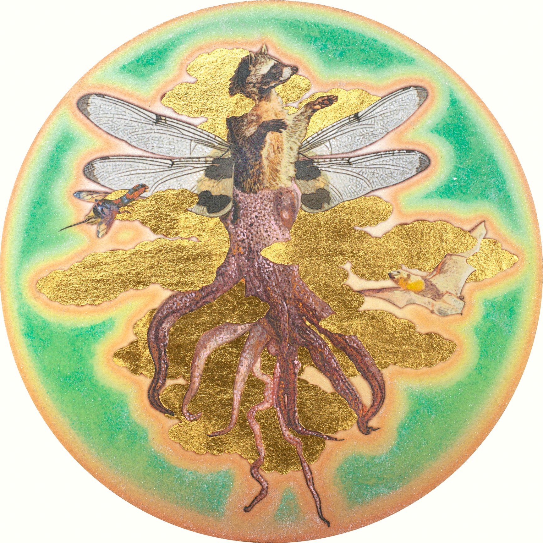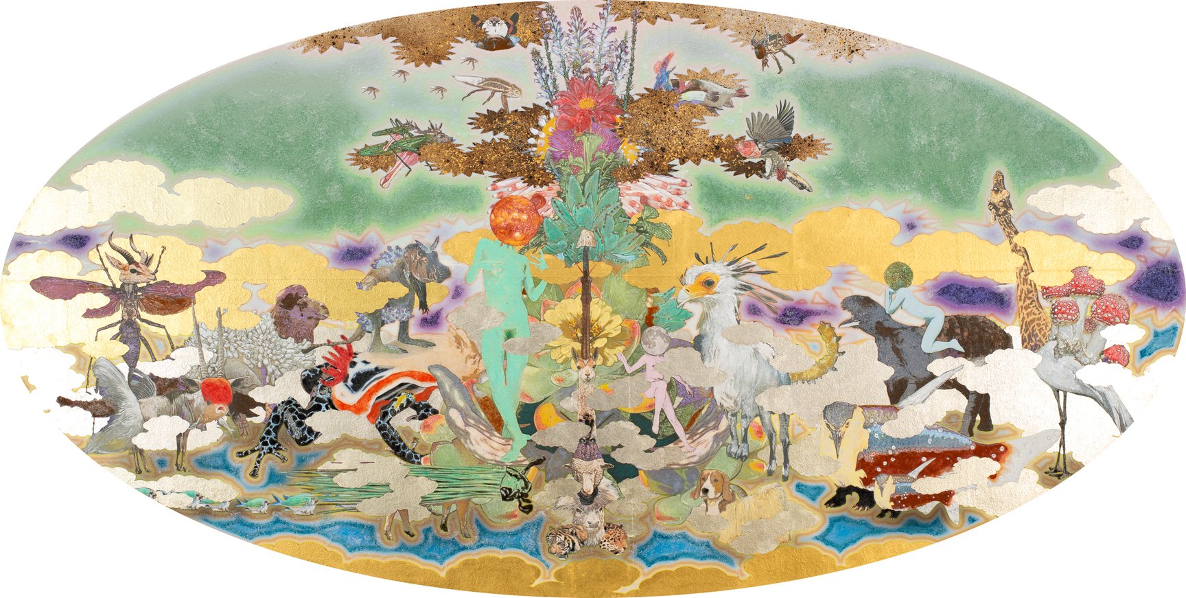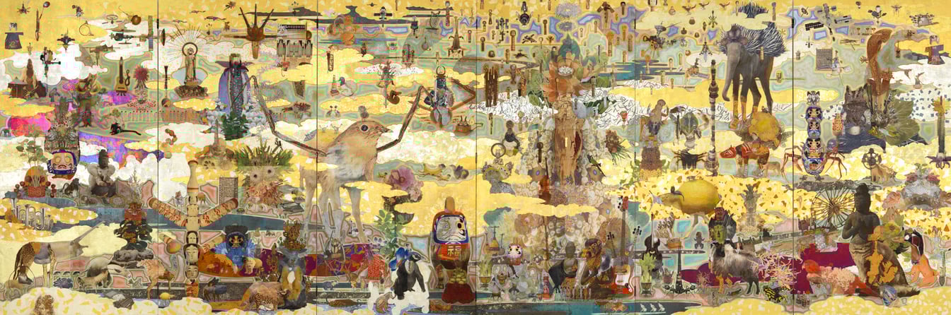 鴻崎正武は1972年、福島県生まれ。東京藝術大学大学院在籍中に青木繁記念大賞を受賞。オランダの画家 ヒエロニムス・ボッシュや、妖怪が練り歩く様子を表した「百鬼夜行図」、狩野永徳の「洛中洛外図屏風」などから影響を受け、平面上に盛り上げた金銀箔の雲に生物や事物を埋め尽くす作風で知られている。代表作「TOUGEN」シリーズは古代中国の理想郷「桃源郷」をテーマに制作され、近作では生まれ故郷である東北を題材とした屏風作品を展開。仏像や東北みやげとして知られているこけし、達磨などが動植物と混合した不思議な生き物(キメラ)が描かれている。