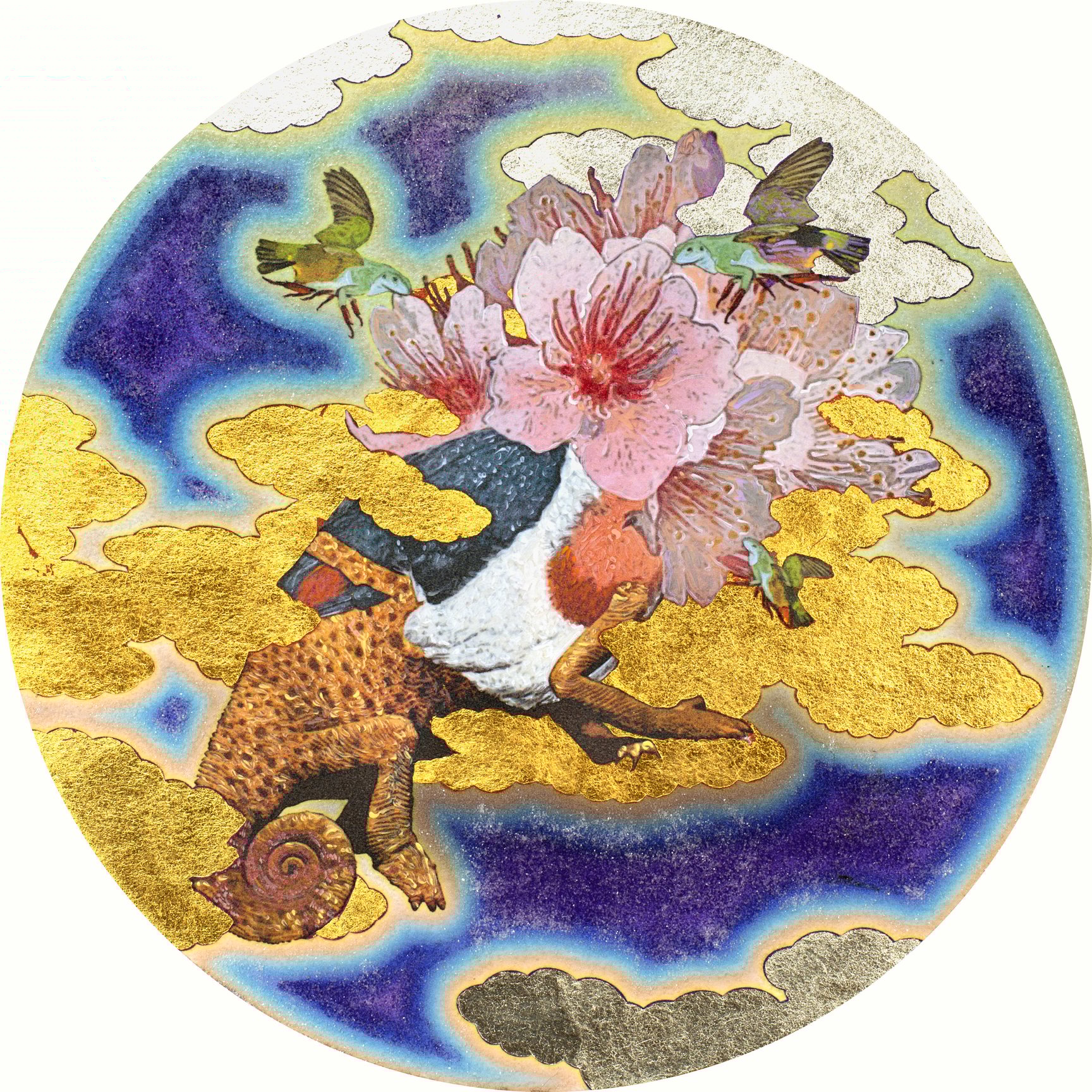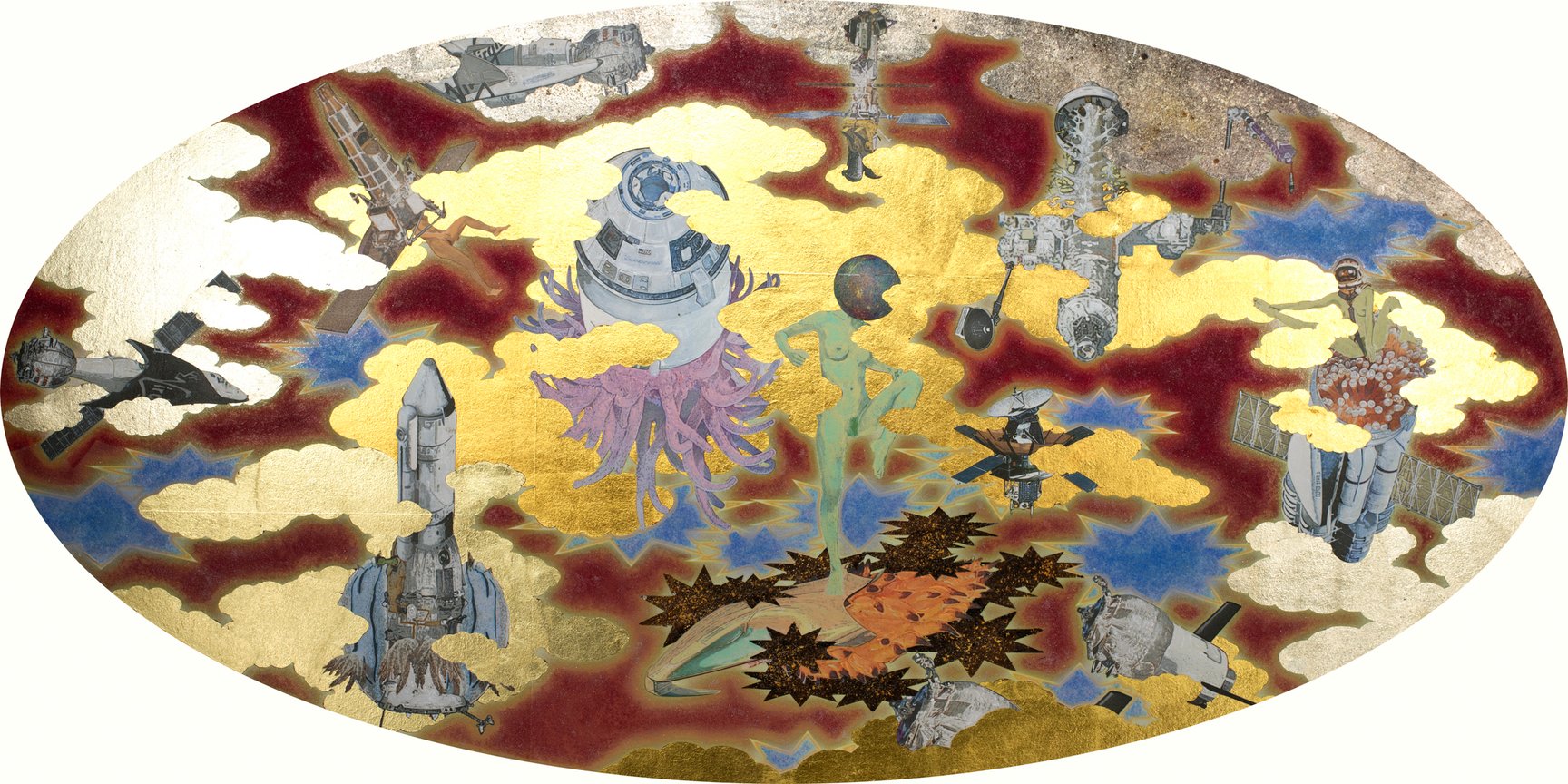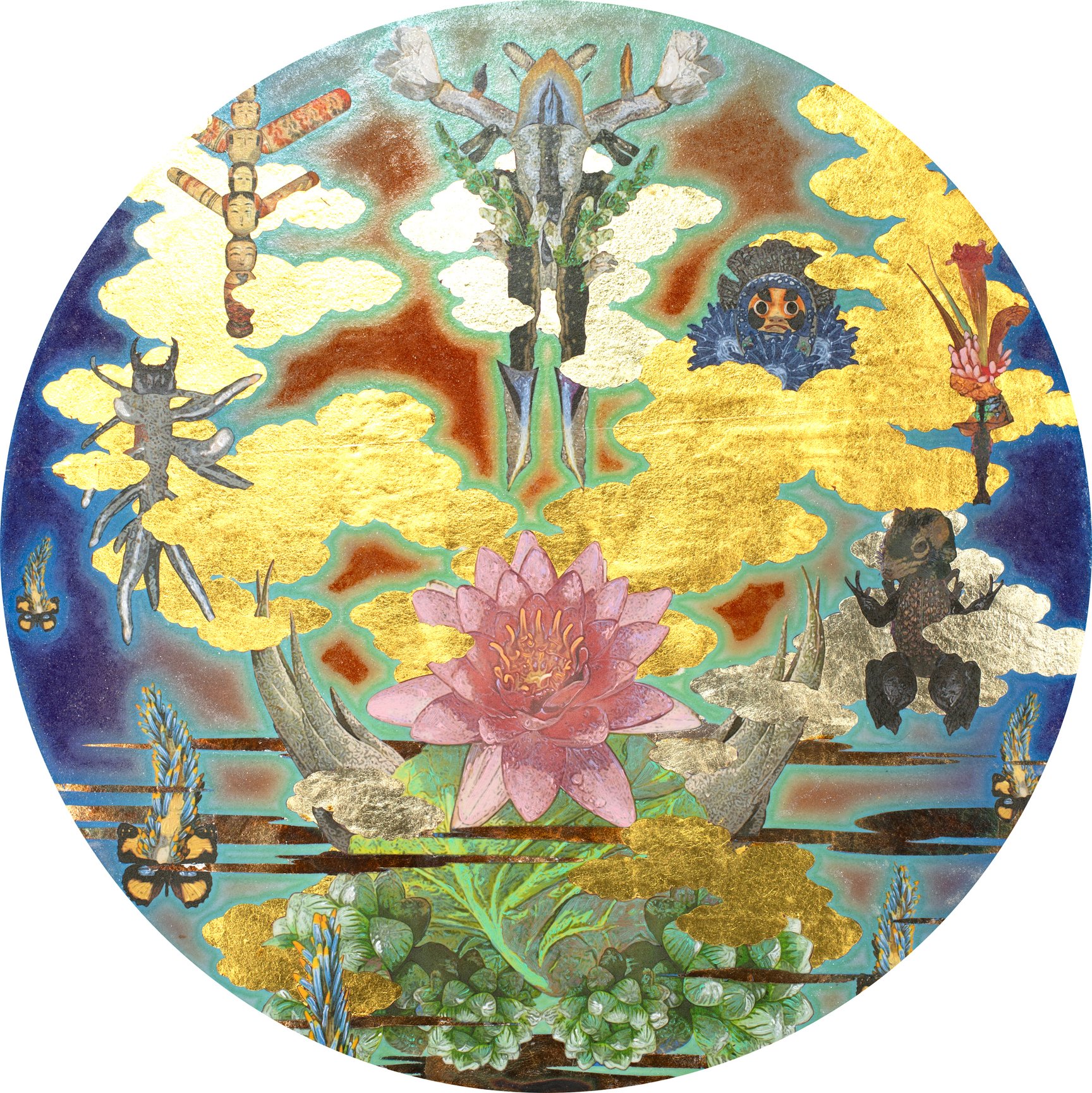 鴻崎正武は1972年、福島県生まれ。東京藝術大学大学院在籍中に青木繁記念大賞を受賞。オランダの画家 ヒエロニムス・ボッシュや、妖怪が練り歩く様子を表した「百鬼夜行図」、狩野永徳の「洛中洛外図屏風」などから影響を受け、平面上に盛り上げた金銀箔の雲に生物や事物を埋め尽くす作風で知られている。代表作「TOUGEN」シリーズは古代中国の理想郷「桃源郷」をテーマに制作され、近作では生まれ故郷である東北を題材とした屏風作品を展開。仏像や東北みやげとして知られているこけし、達磨などが動植物と混合した不思議な生き物(キメラ)が描かれている。