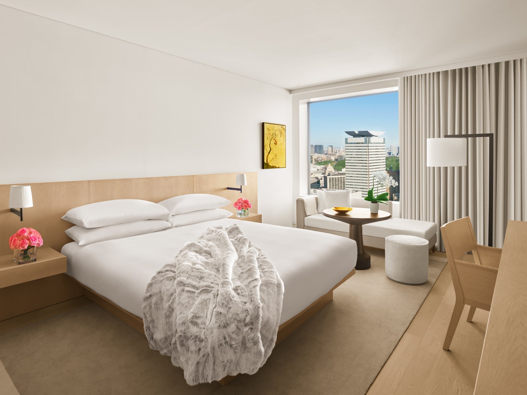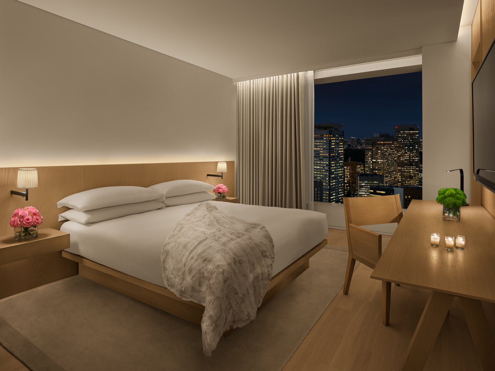 22室のスイートルームを含む全206の客室には、キッチンや充実したラインナップのミニバーを備え、3室のスイートルームを含む15室のゲストルームには屋外テラスも展開。ベッドに用意されているひざ掛けはイアン・シュレーガーが制作したマニュアルに沿って位置や形など細部まで調整してかけられている。客室料金は6万円からで、オープニング記念として期間限定で4万8000円から宿泊することができ、「Go To トラベルキャンペーン」にも適用される。