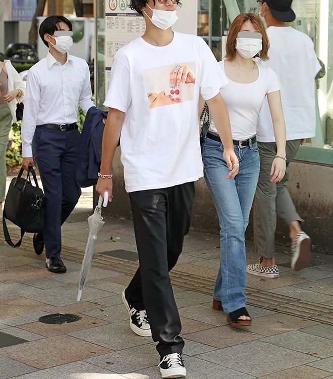 2020年9月の原宿。プリントTシャツのこちらの男性が「シェーヌダンクル」と思われるブレスレットを着用していた。