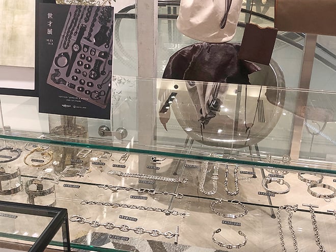 そんなトレンドを牽引するショップのひとつが、(株)ベイクルーズが2018年にオープン(2019年9月に青山から新宿のEDIFICE(エディフィス)内に移転オープン)したメンズジュエリー専門のセレクトショップ「WORLDLY-WISE(ワールドリーワイズ)」だ。Hermèsのほか、Tiffany & Co.(ティファニー)やCartier(カルティエ)といったメゾンのメンズのヴィンテージジュエリーに加え、DAIKI SANO(ダイキサノ)やMaison Margiela(メゾンマルジェラ)などのジュエリー、さらにはLOUIS VUITTON(ルイヴィトン)のバッグやROLEX(ロレックス)のヴィンテージウォッチなども取り扱っている。