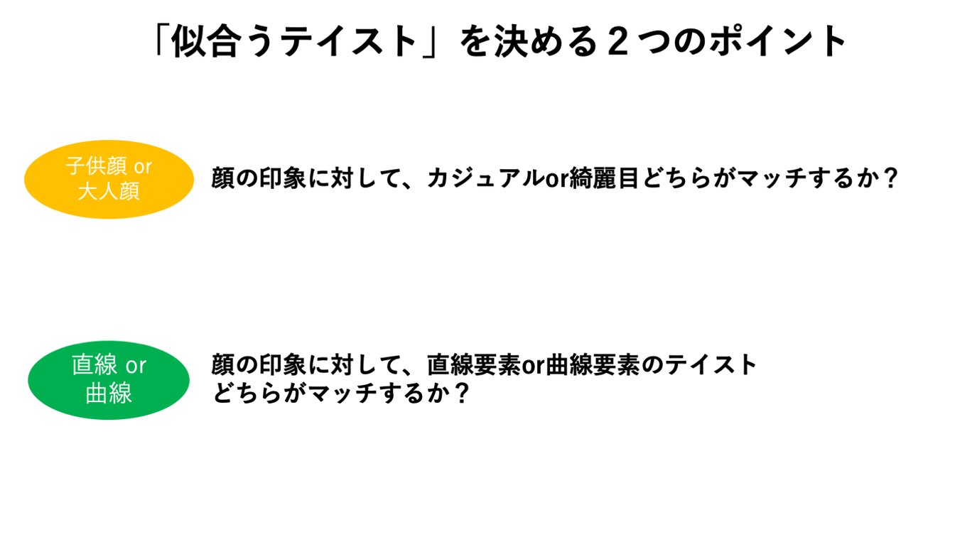 これは体型の要素も無くはないですが、大きくは顔の印象にマッチするか?という視点で見ていきます。